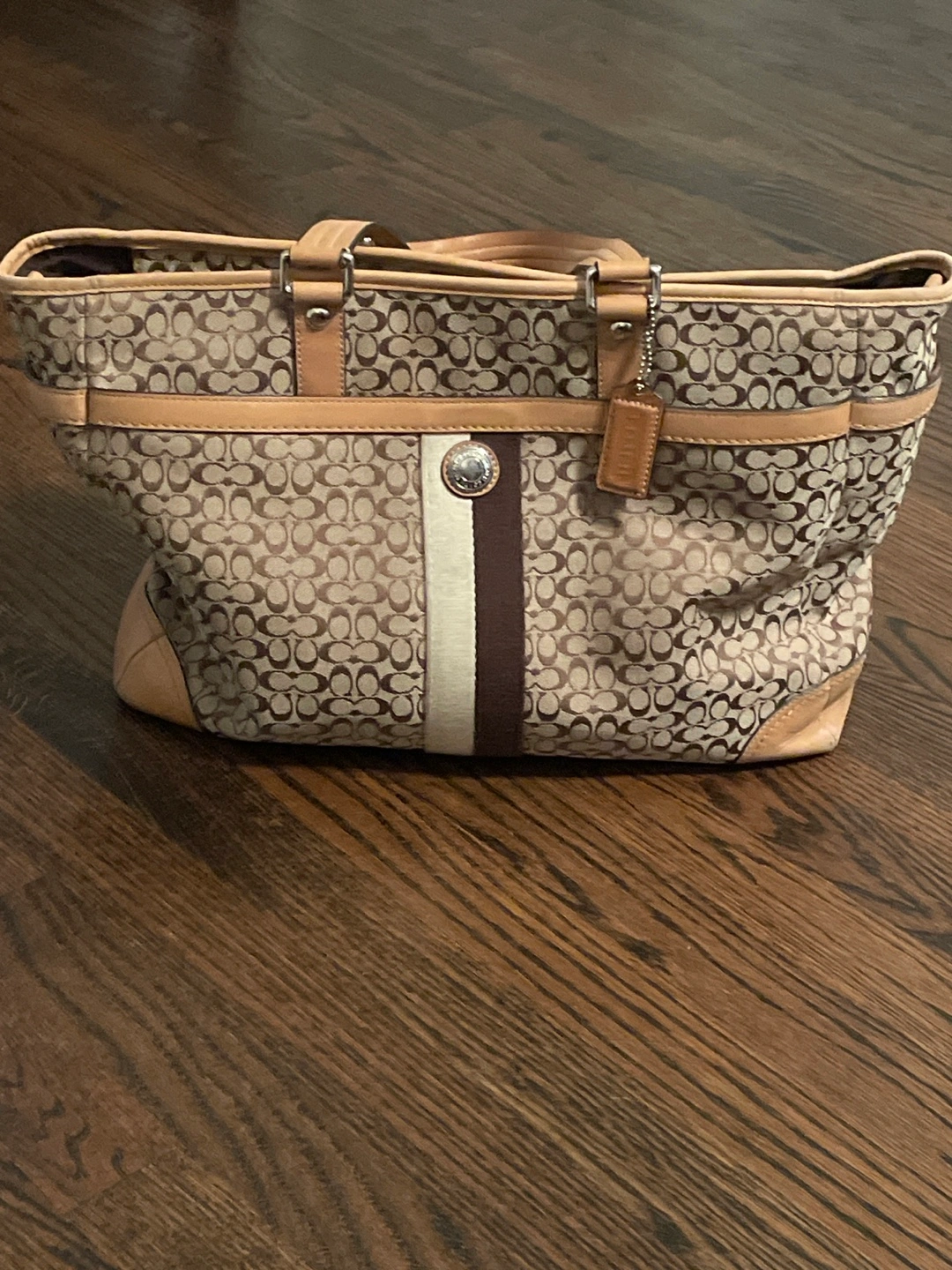 Large brown and tan Coach tote bag. Signature C pattern. Tan leather trim. Double handles. Interior pockets