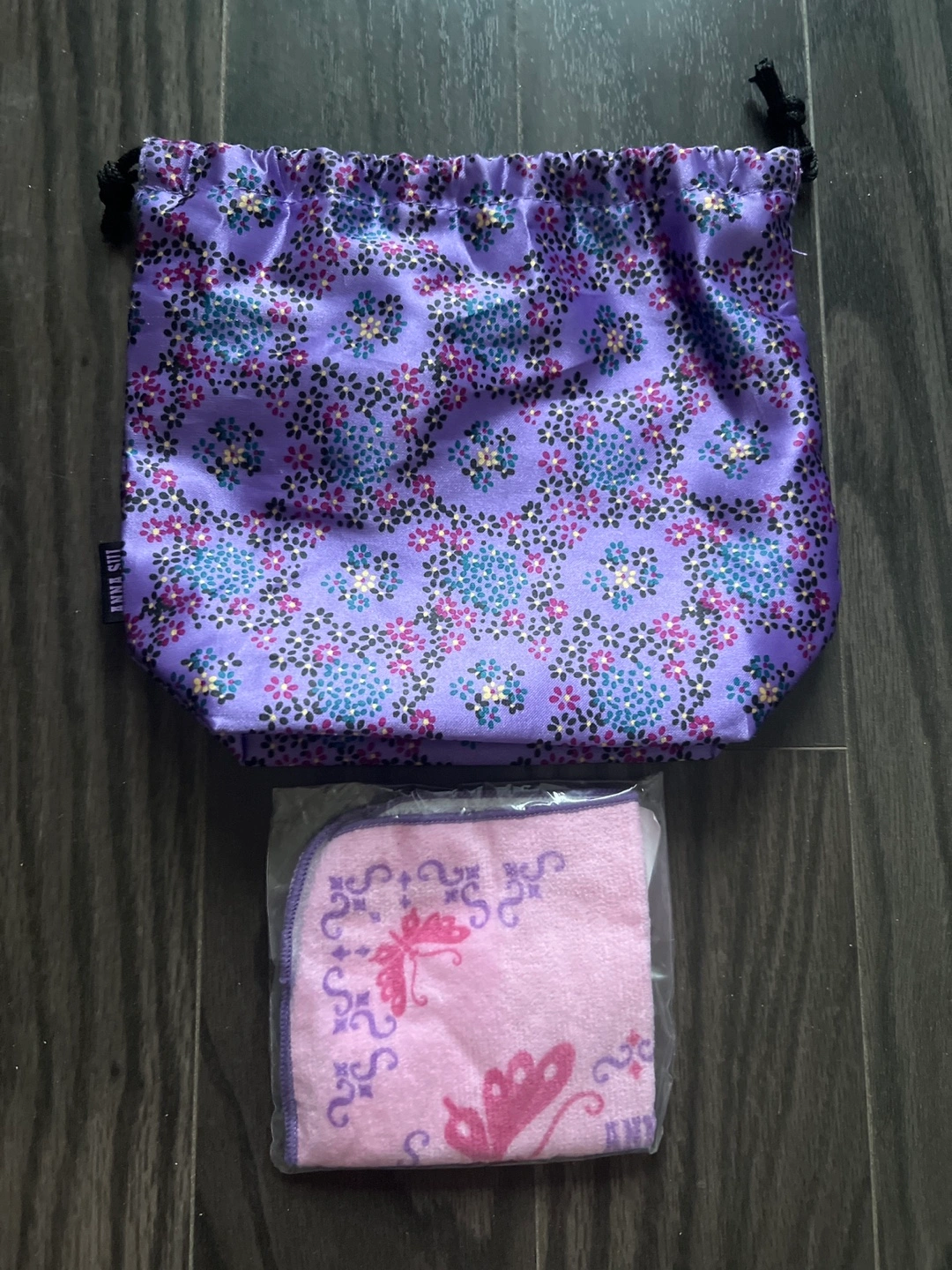 Anna sui Purple floral drawstring bag. Includes a pink cleaning cloth with butterfly design. Perfect for travel or organization.