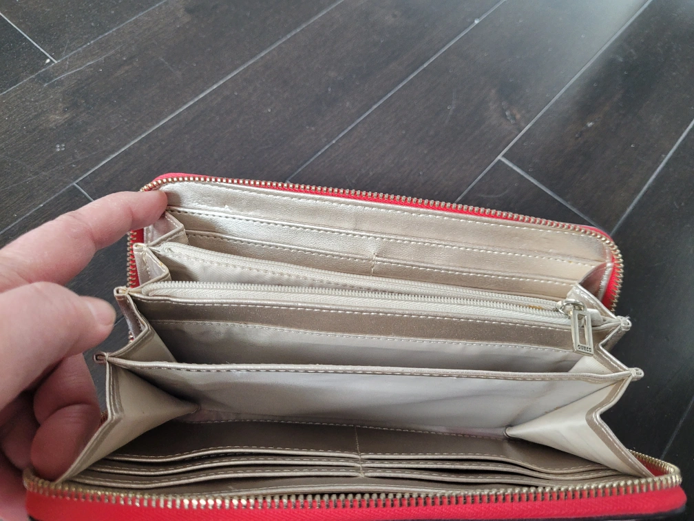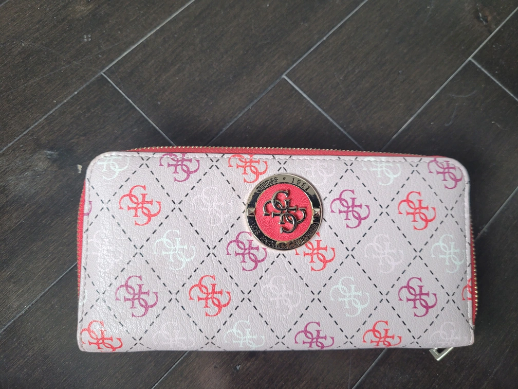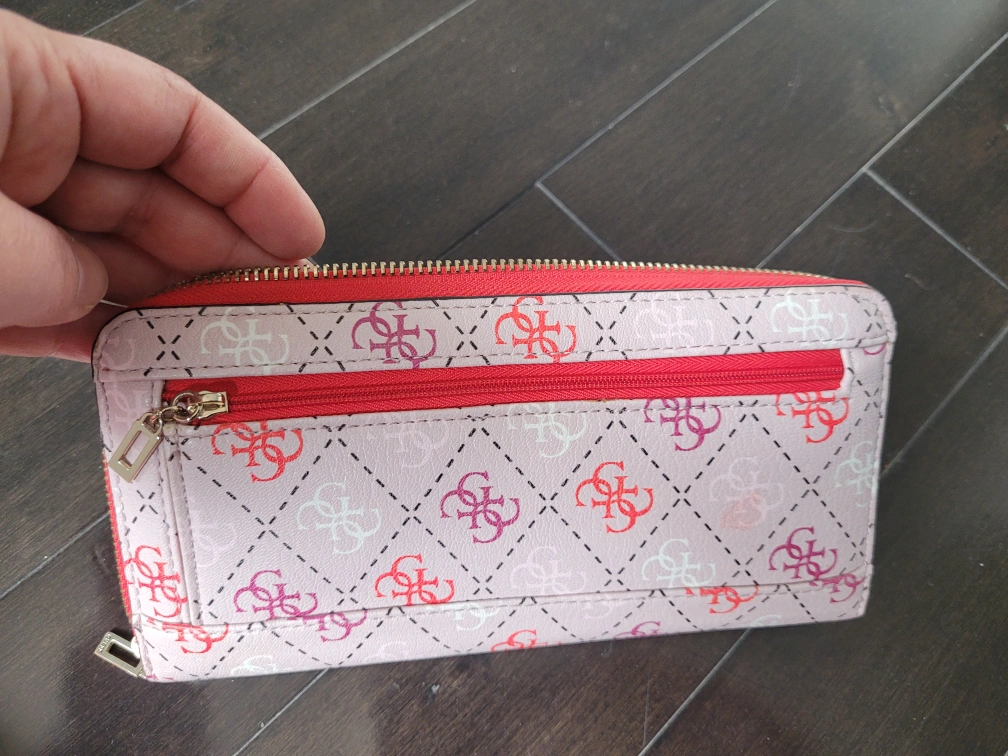 Women's Guess zip around wallet. Red zipper, multiple card slots and compartments. Coral and white patterned exterior. Excellent condition.