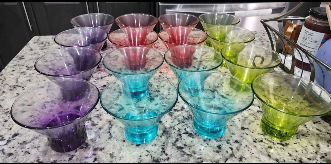 Twelve coloured glass dessert bowls. Various shades of purple, pink, green, and blue. Great for parties or everyday use.