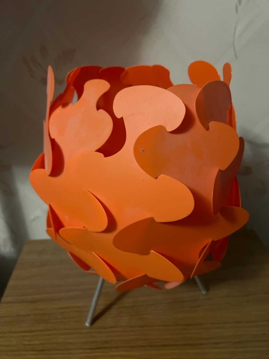 Cute orange table lamp. Unique design, three-legged base. Provides ambient lighting. Perfect for a bedside table or small space.
