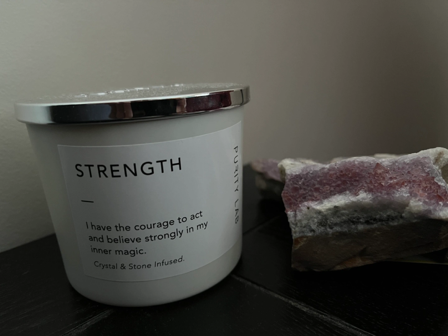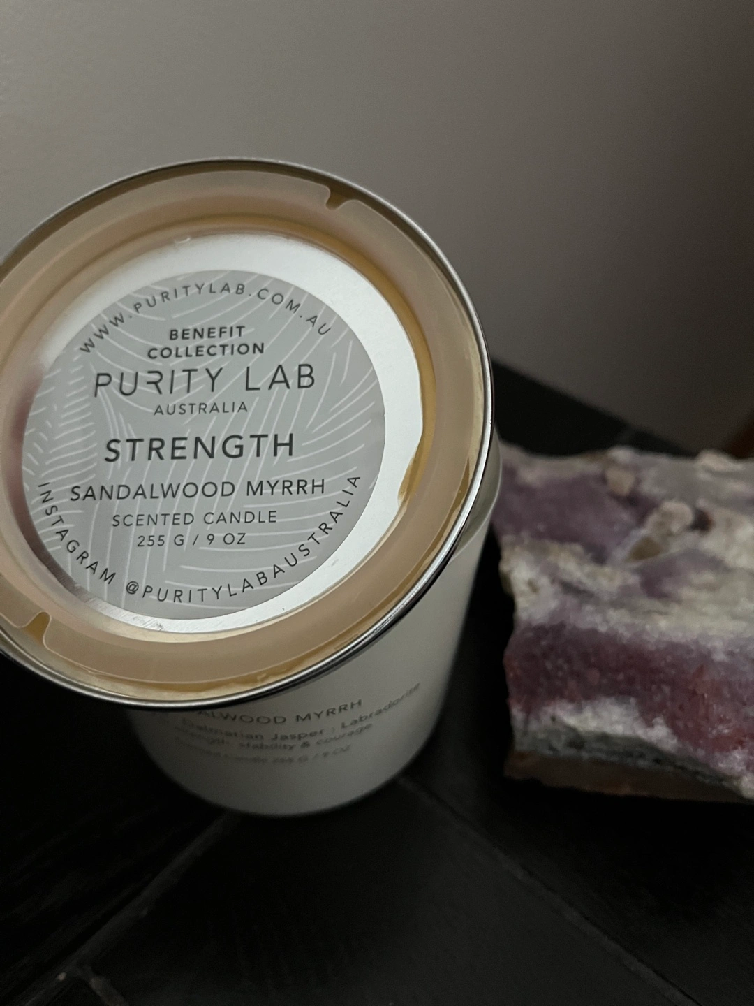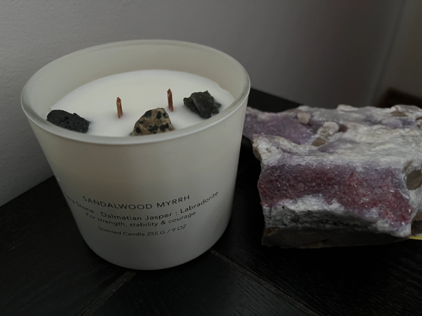 Sandalwood Myrrh scented candle. Crystal and stone infused. 255g/9oz. Lava stone, Dalmatian Jasper, Labradorite. For strength, stability and courage. Unopened. Cash or e-transfer accepted. Will deliver for additional charge.
