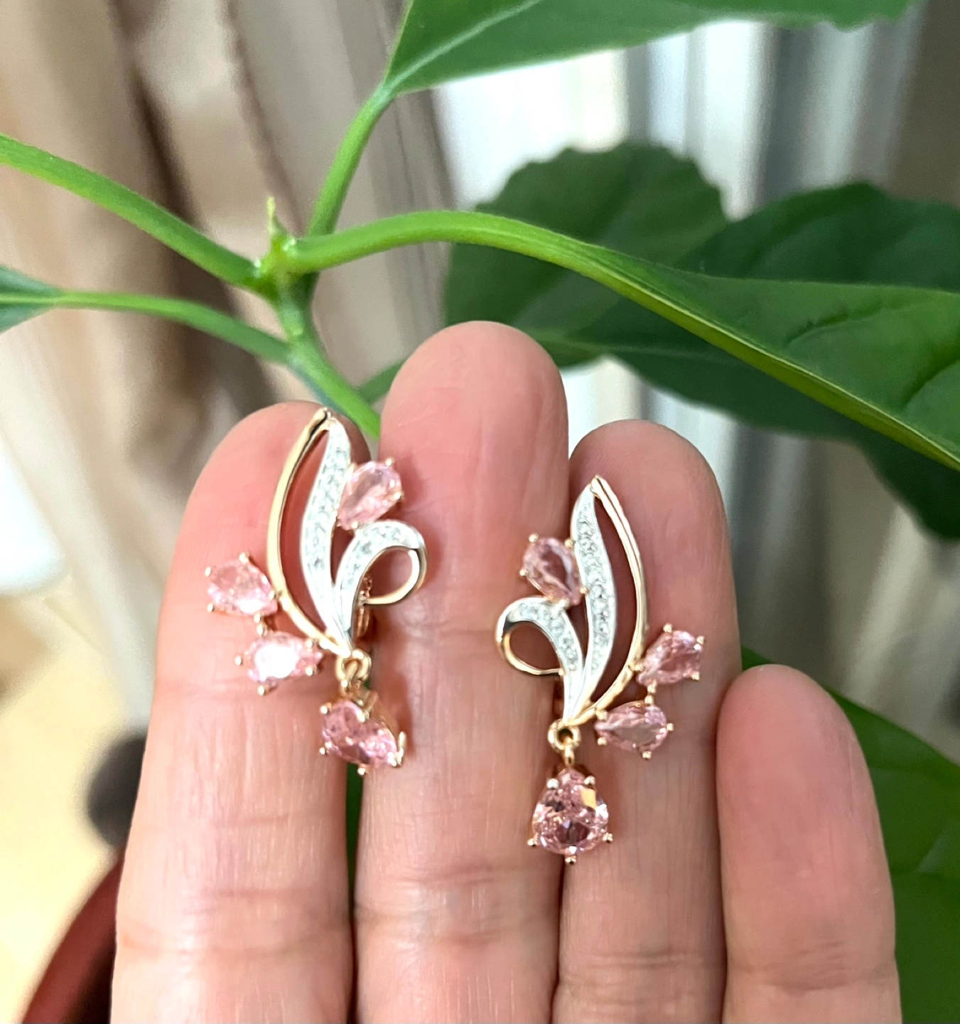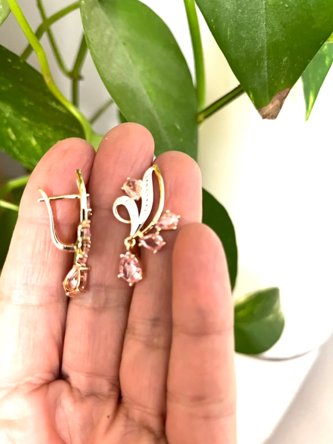 Beautiful dangle earrings. Features pink and white zircon. Rose gold metal. Unique floral design. 14 k gold plates . Perfect for adding a touch of elegance to any outfit.