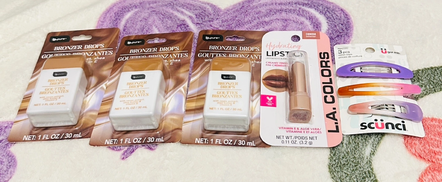 3 tubes of b.pure bronzer drops, one L.A. Colors hydrating lipstick, and three Scunci hair clips. All new.