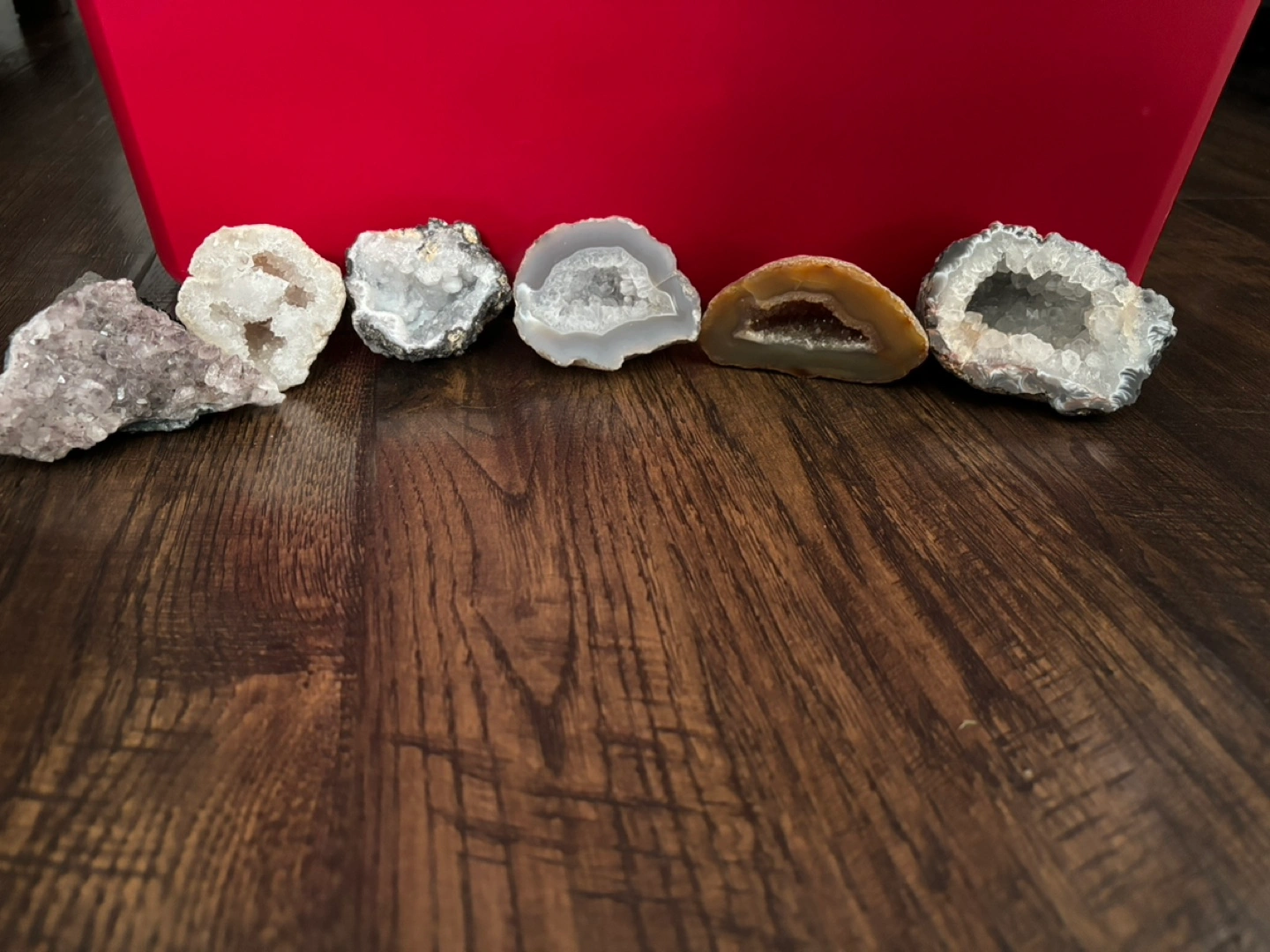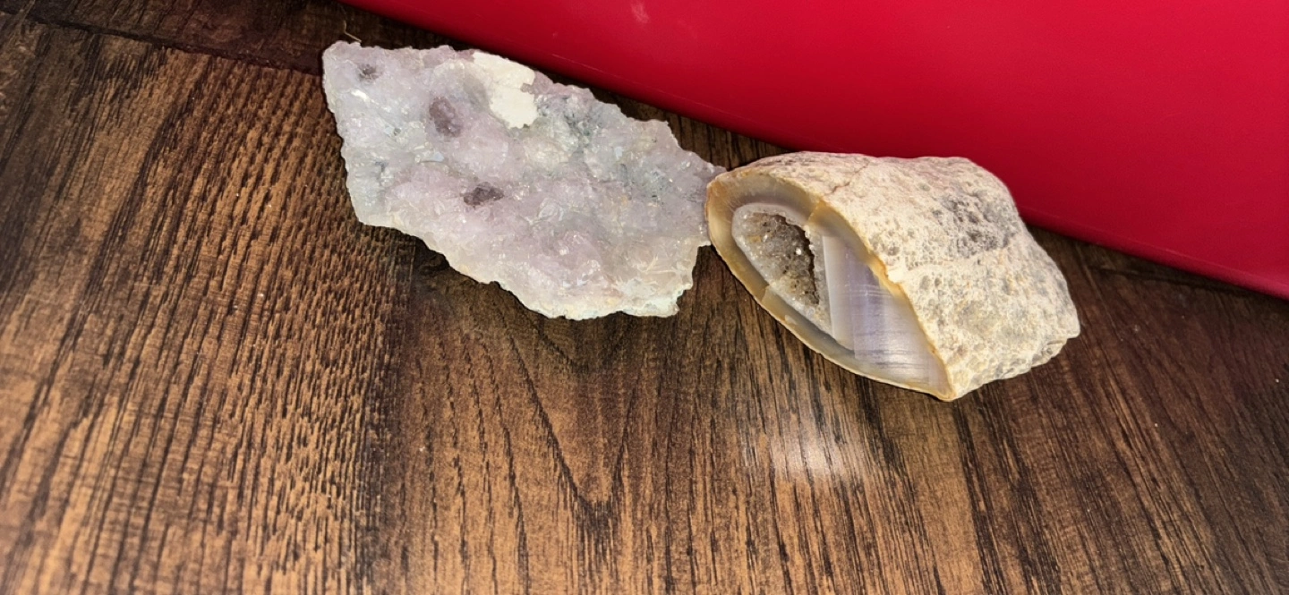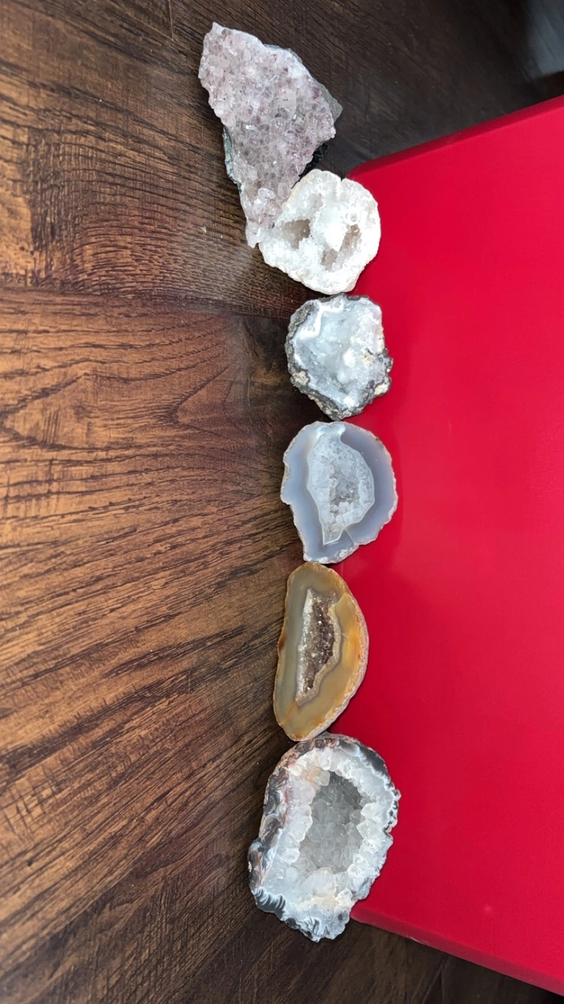 Seven beautiful geodes and crystals, including amethyst and agate. Various sizes and colours. Two additional crystals on cords. Perfect for collectors or home décor. Starting from 5$- 10$ depending on what you’d like