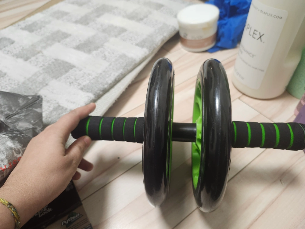 Double wheel ab roller. Great for core strengthening exercises. Features comfortable foam grips.