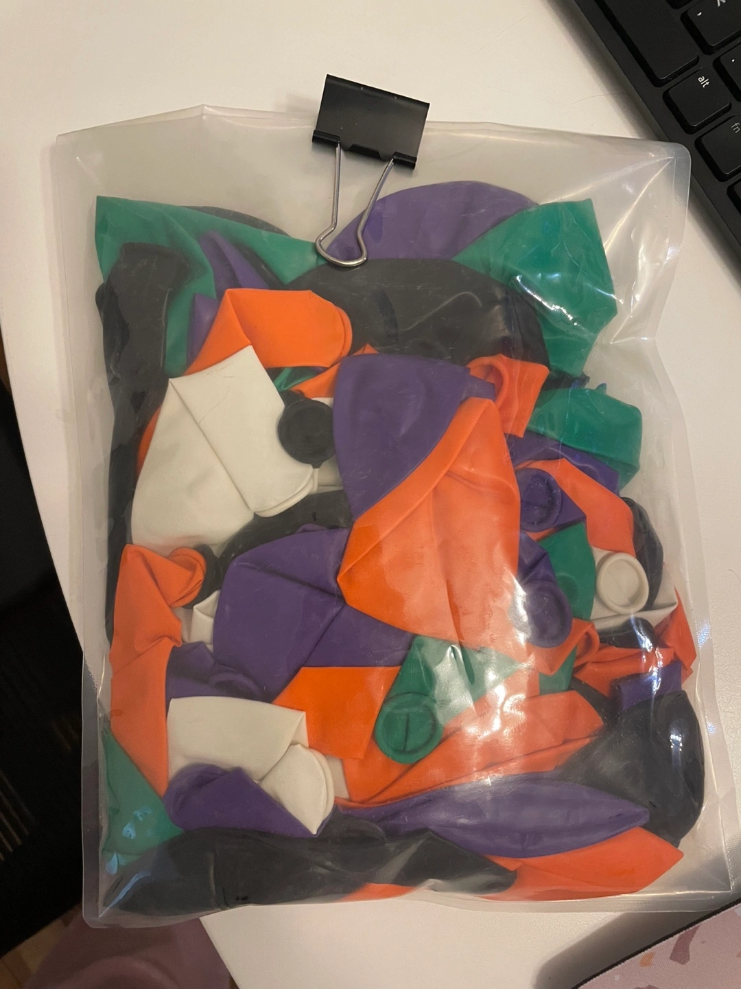Bag of assorted colour balloons. Includes orange, purple, green, black and white. Uninflated. You can prepare Halloween π