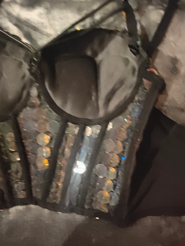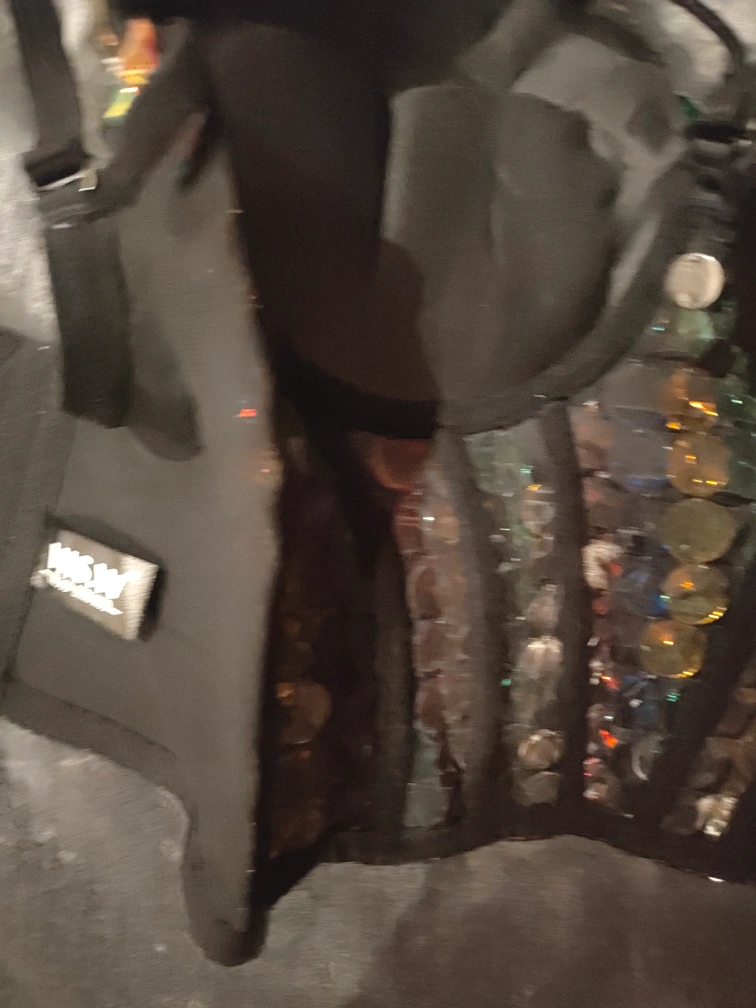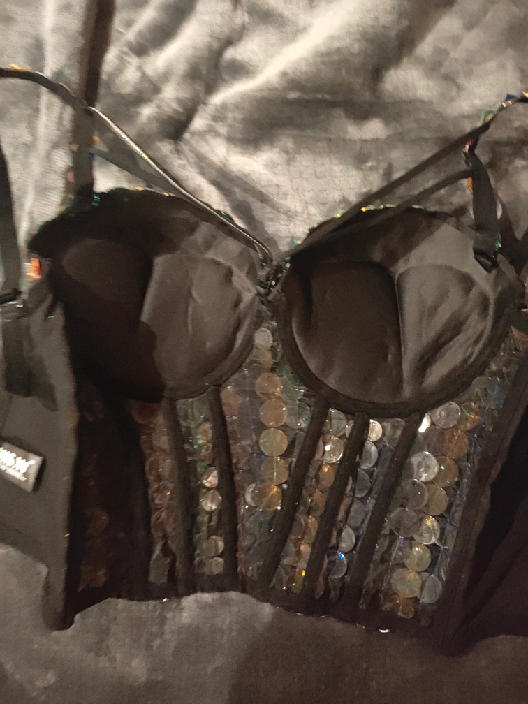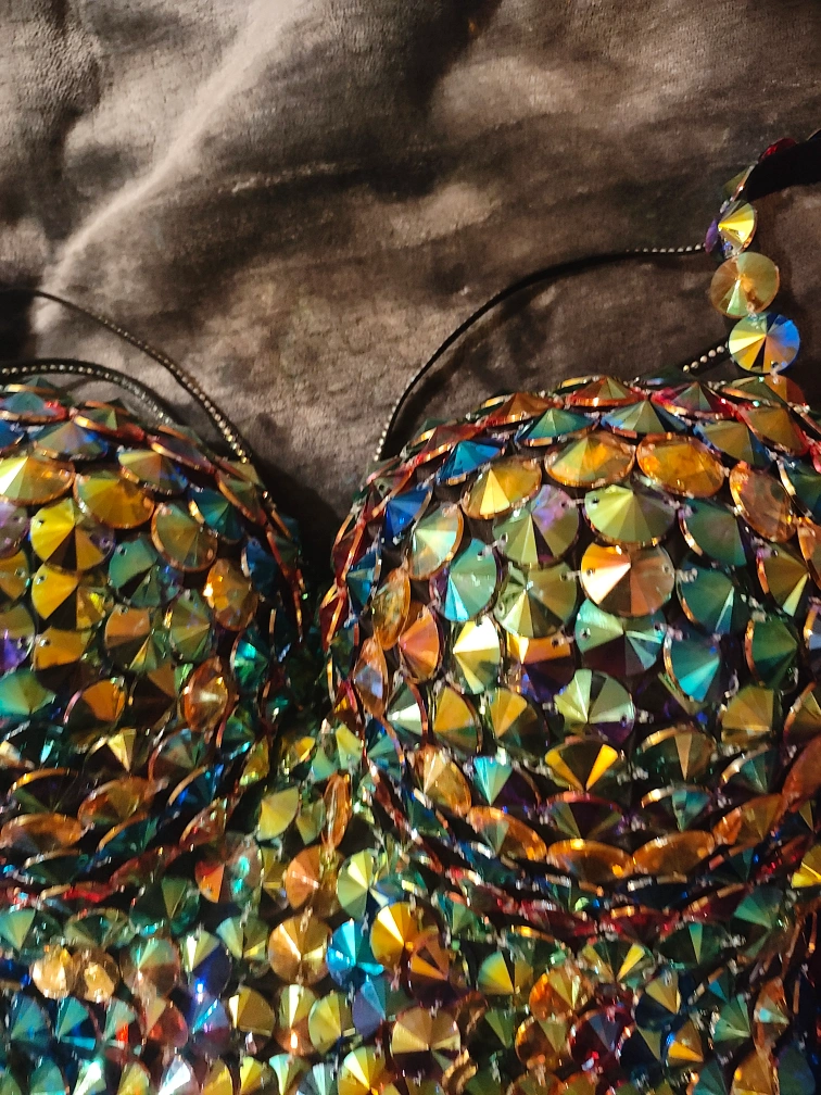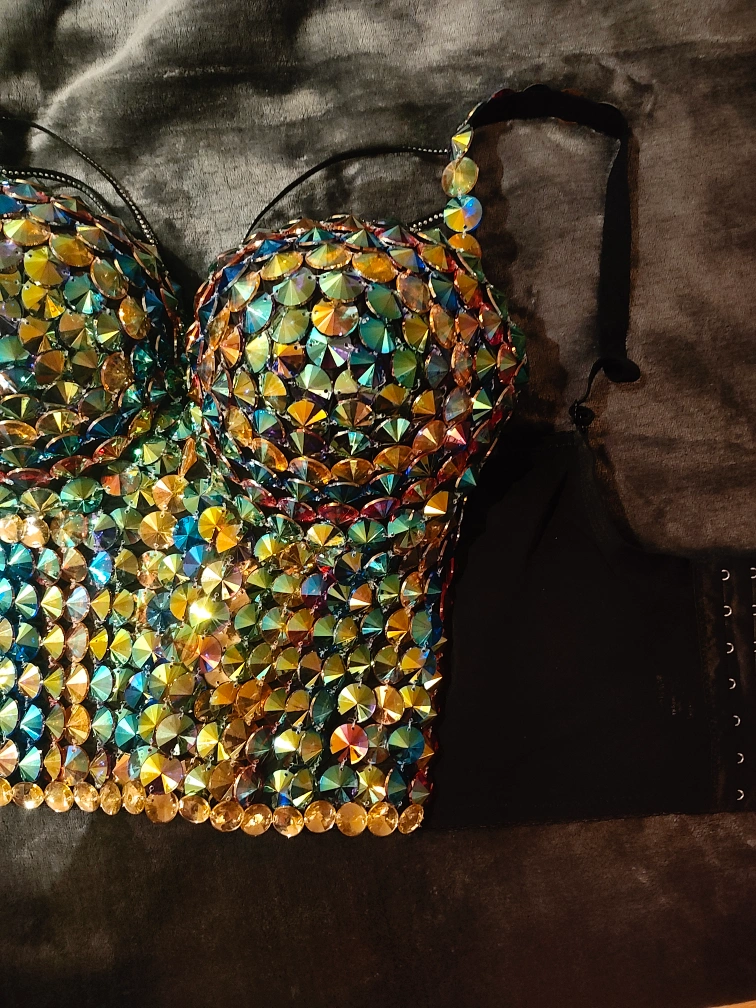 Stunning corset top. Features iridescent rhinestones. Black fabric base. Adjustable straps. Back lacing. Unique design.