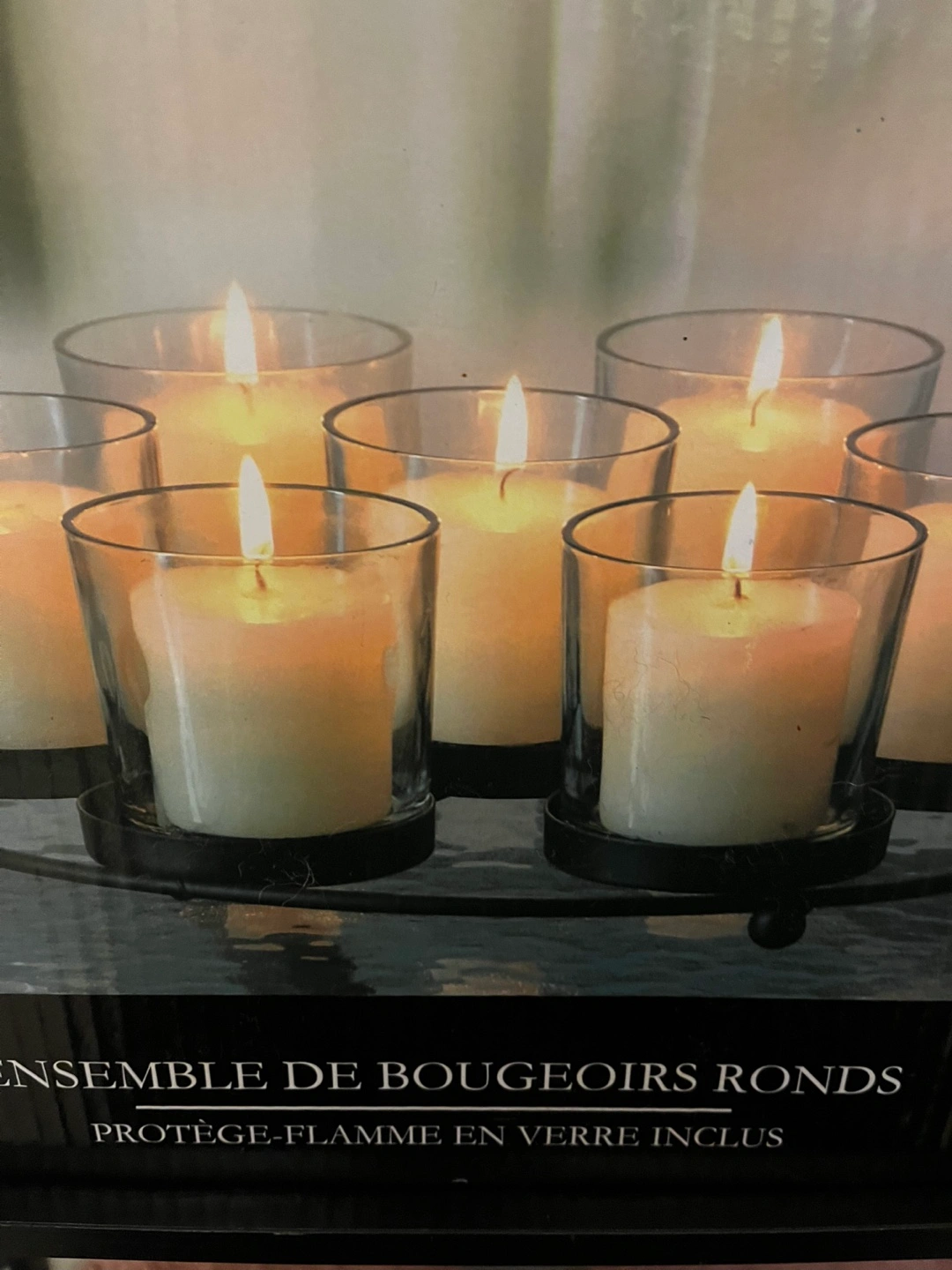 Eight glass votive candle holders on a round metal base. Includes unscented pillar candles. Perfect for centrepieces or home decor.