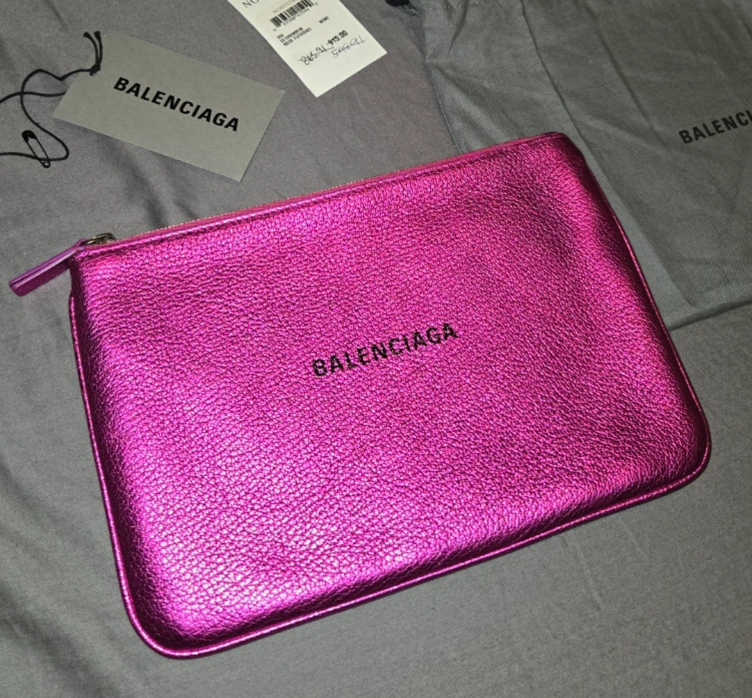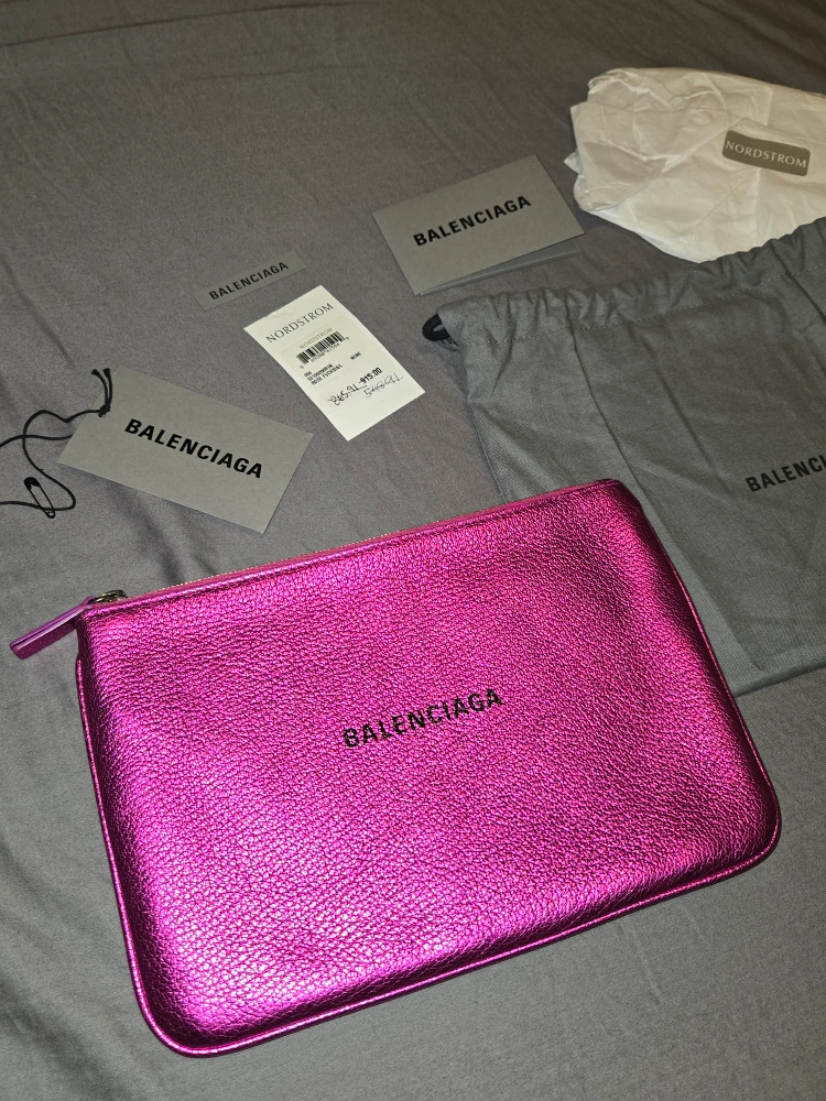 Balenciaga everyday pouch ~Rose fuchsia metallic with embossed black logo ~Grained leather exterior ~Smooth black leather interior ~Zipper closure ~Interior slip pocket with silver embossed Balenciaga logo ~Made in Italy ~9.5" x 6" Pristine condition, only used a couple times! Comes with dustbag and tags