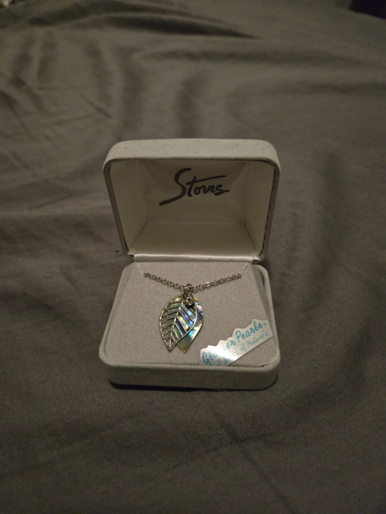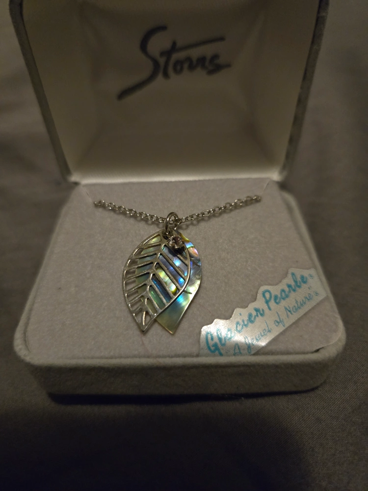 Silver plated leaf with rhinestone pendant floating on abalone leaf below. Approximate size 25 x 14mm (1 x 0.5″) including bale. Beautiful iridescent abalone shell is found in the Pacific Ocean and ranges in colour from blue and purple to green and pink – no two pieces are exactly alike. The shell used is from government regulated, managed fisheries – no wild abalone is disturbed. Glacier Pearle® is a trade name used for abalone jewellery.