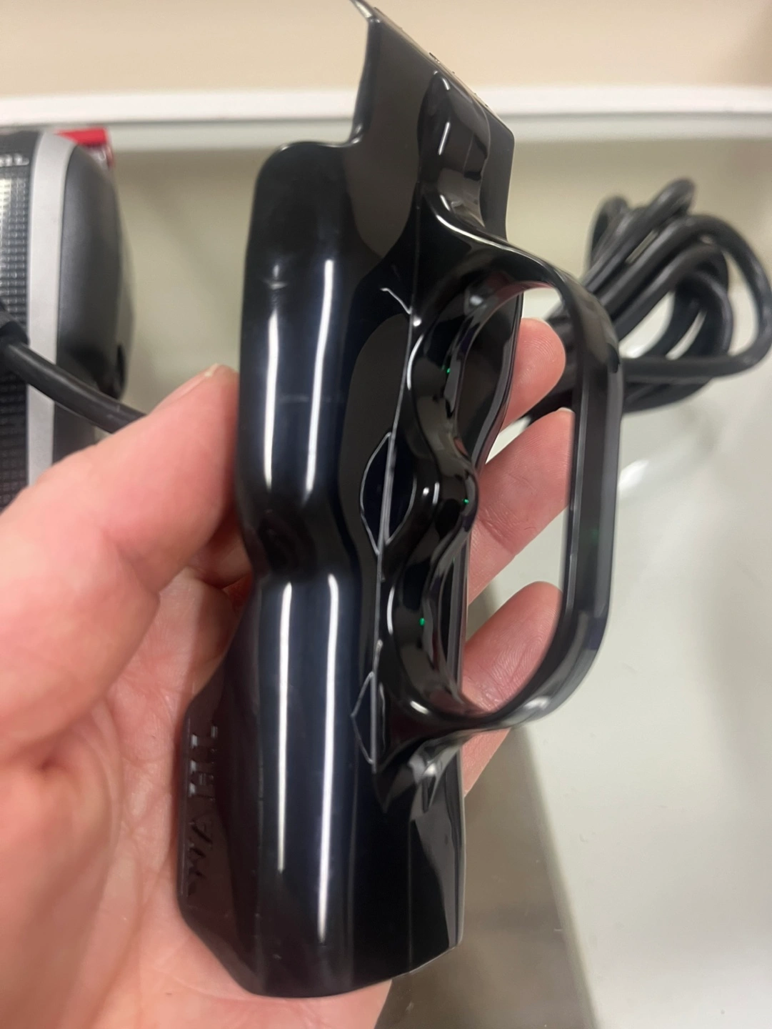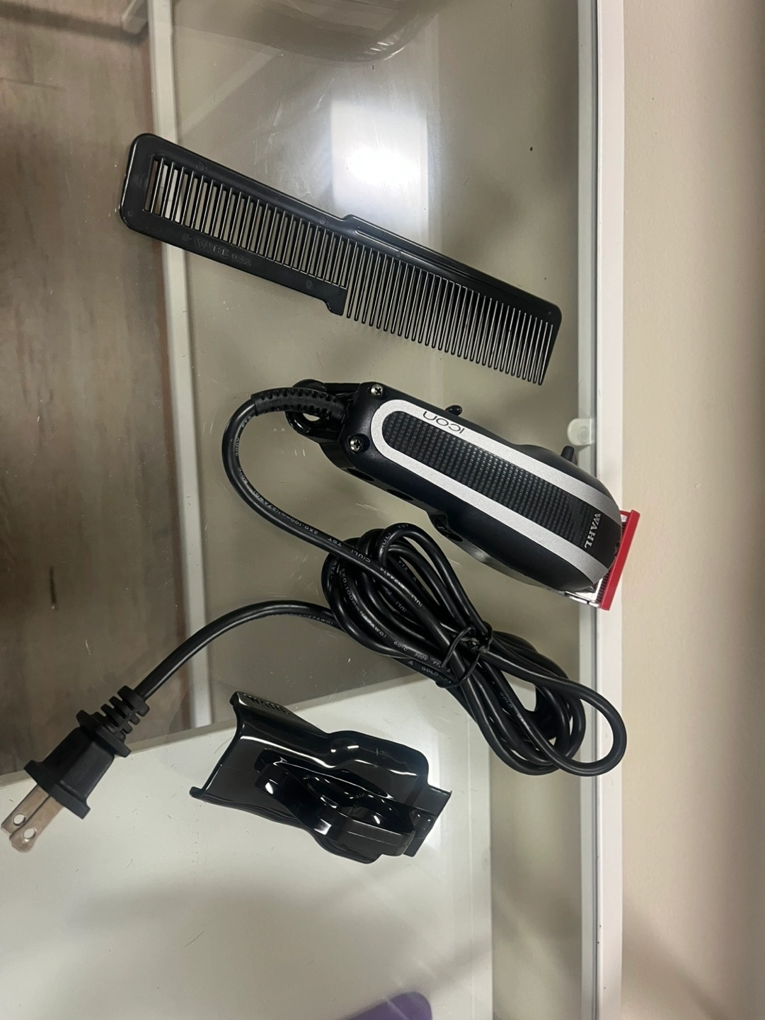 Corded hair clipper, includes comb and oil. Good condition. Black and silver.