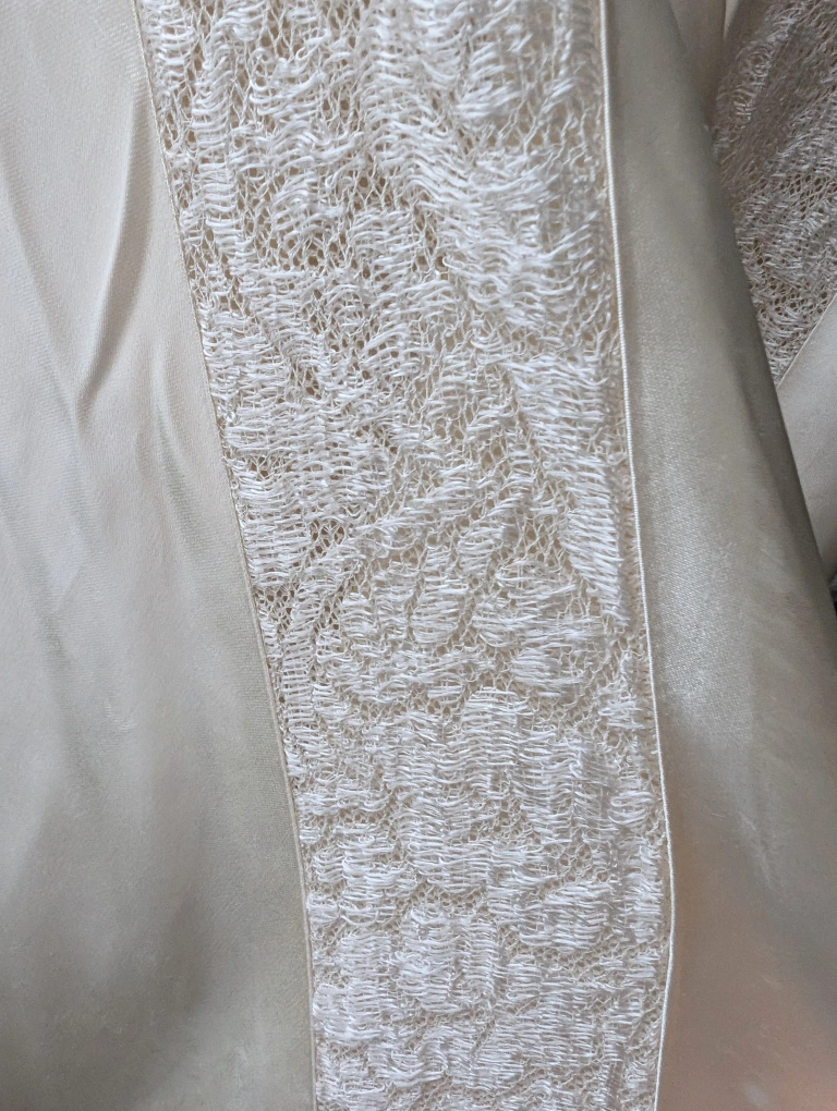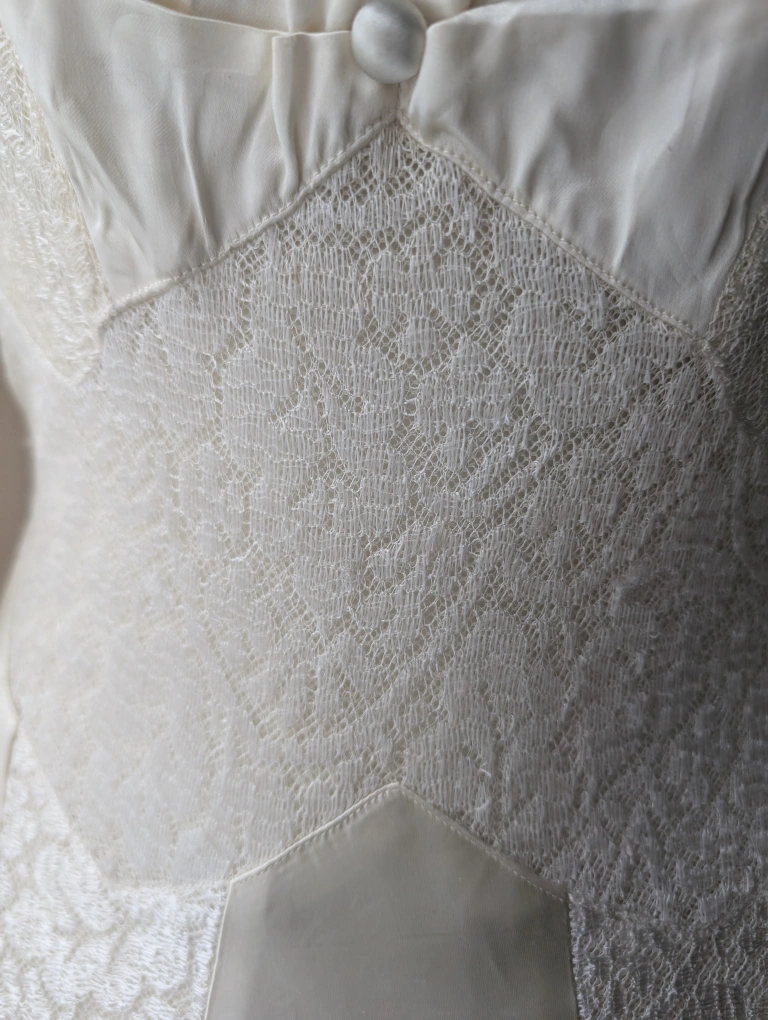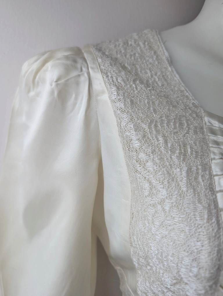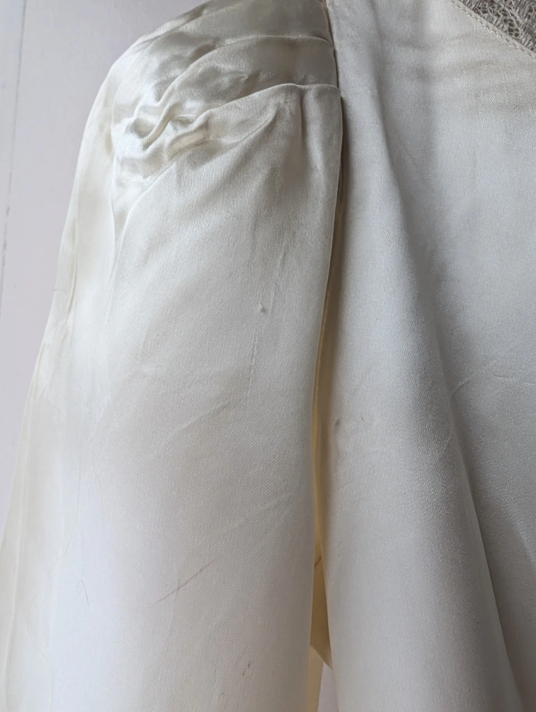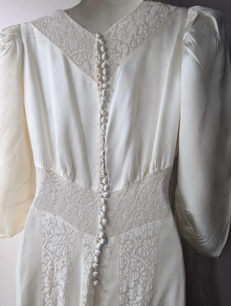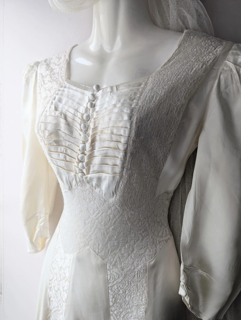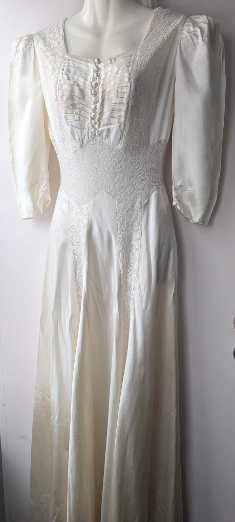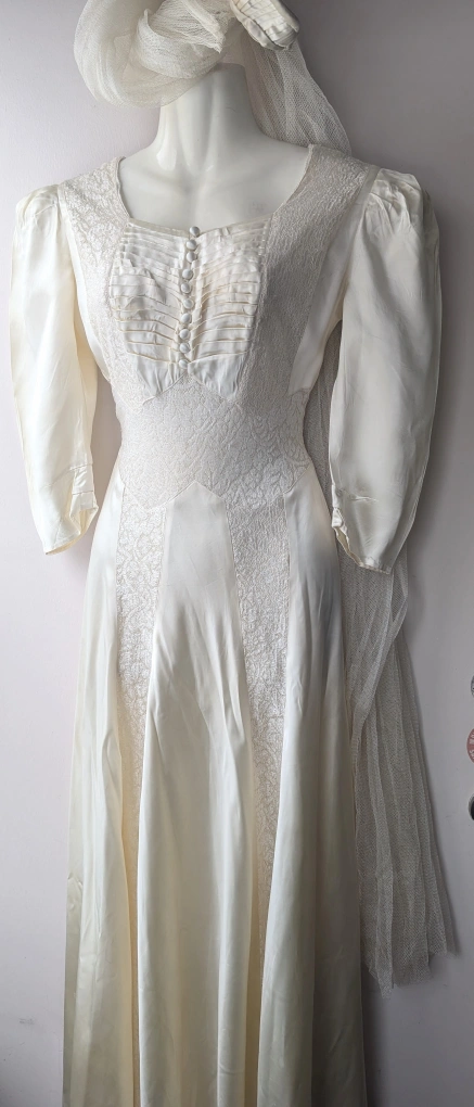 Stunning handmade vintage cream white satin and lace Wedding dress AND veil from the 40's era - needs work, not 100% pristine Satin or satin like fabric with soft weaved lace panels Size small - some flaws, not new, not in pristine condition. This beautiful dress is decades old and still wearable with some love and care Cream or off white colour 3/4 length sleeves with rusched shoulders Fabric gathered just above waistline Buttons and pleats on front, button back Matching satin crown, cream veil Measurements: taken with garment lying flat, measured in inches, approximate: Length: from top of shoulder to bottom hem: 70" approx Waist: 23-25" Bust: 32-36" Hips: 38 - 40" Item carefully pinched at back for photos. Mannequin is a size extra small, waist 22 inches, A cup bust Not new, but good to fair condition despite its age. No visible holes or tears. There are snags or scuff marks on satin sections and not horribly noticeable. Can really only see up close. Some expected wear on satin buttons. ** The veil has at least two small holes and needs to be re attached to band Can meet up/deliver if not too far away or come take a look at it, it's so lovely