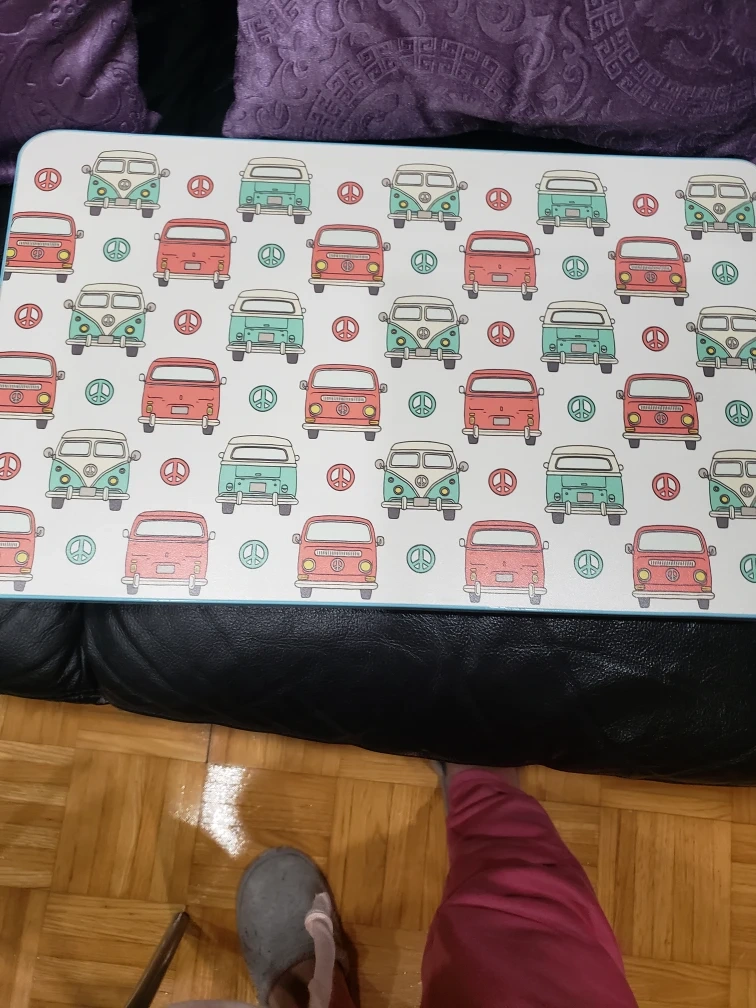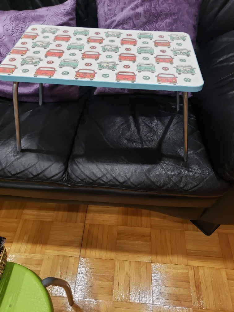 Foldable TV tray table. Features a light blue frame and a retro van design. Perfect for snacking while watching TV or working on your laptop.