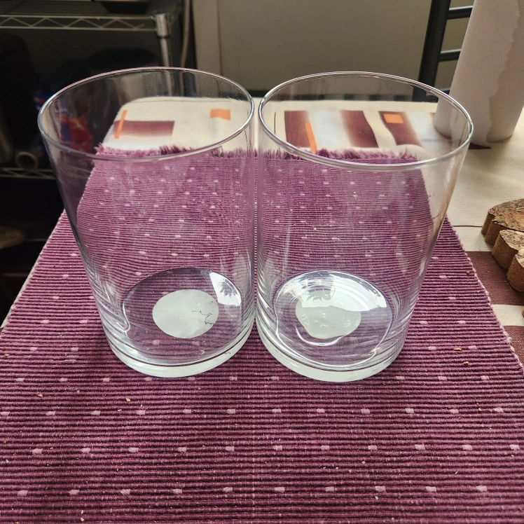 Set of two clear glass tumblers. Approximately 12cm tall. Purchased from the Dollar Store.They cost $1.5 each, now Dollarama has them for $2.00 each. Buy one or both.