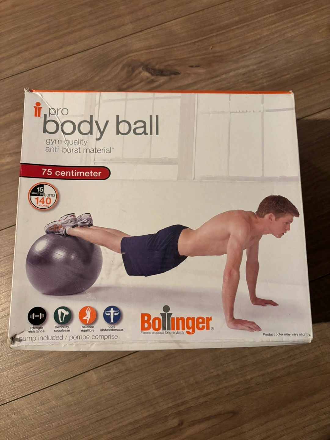 75cm pro body ball. Gym quality anti-burst material. Maximum weight 300lbs. Pump included. Great for strength, flexibility, balance, and core workouts.