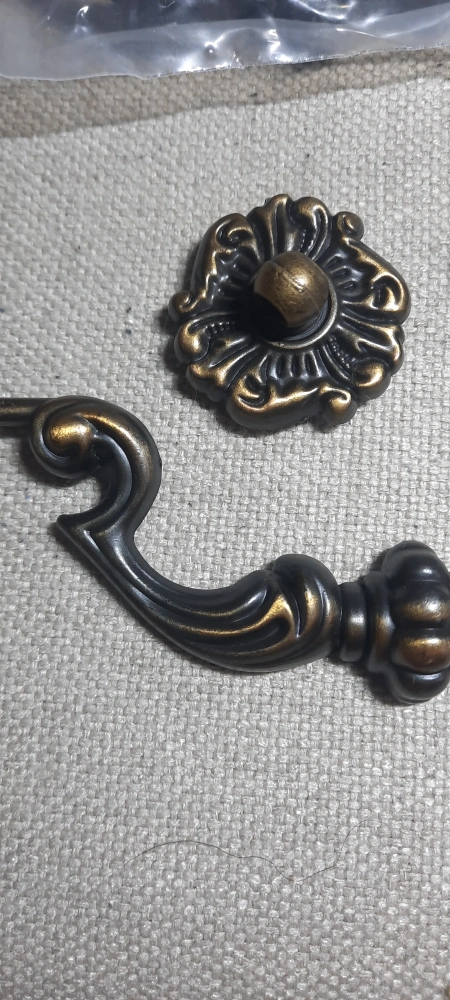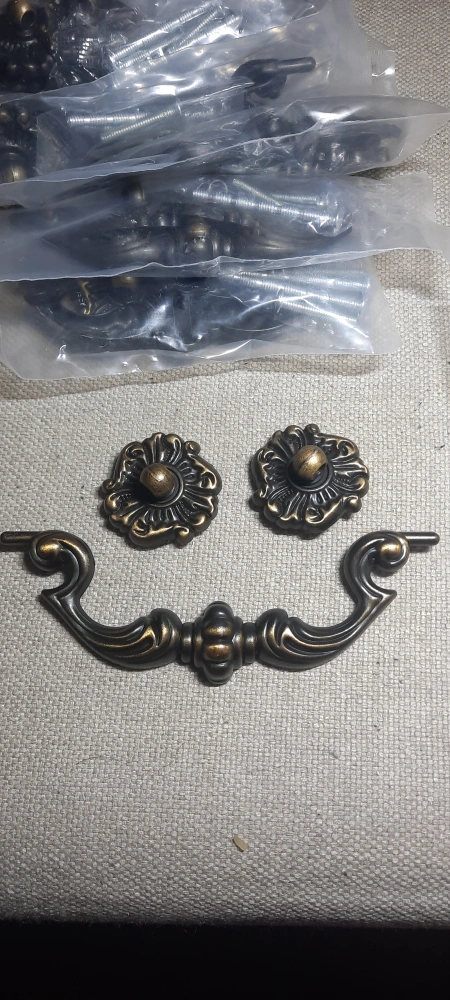 Set of ornate cabinet pulls and knobs. Dark bronze finish. Includes mounting hardware. 10 sets total. Would like to sell as a set of 10. Great for someone looking to do a resto project.