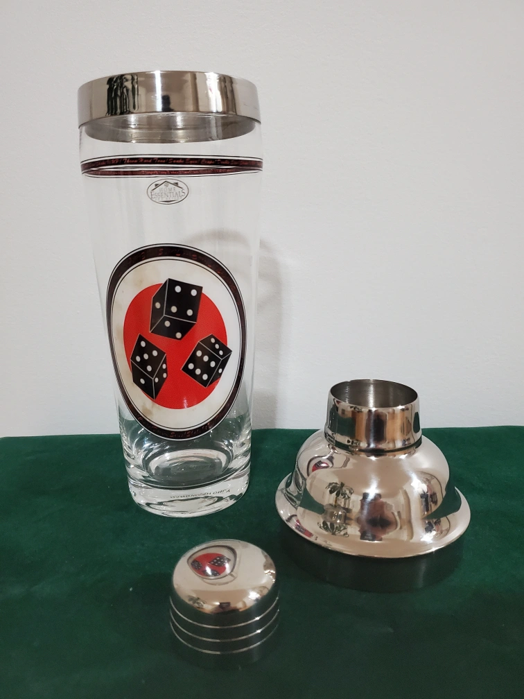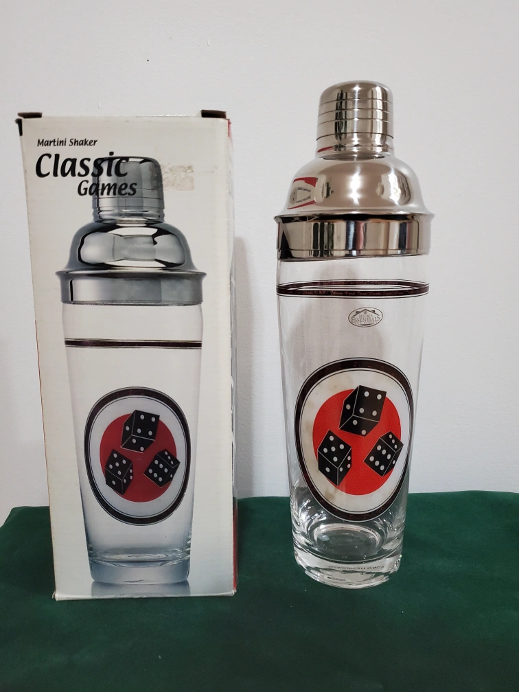 Vintage cocktail shaker. Glass body with a metallic top. Dice design. In original box.