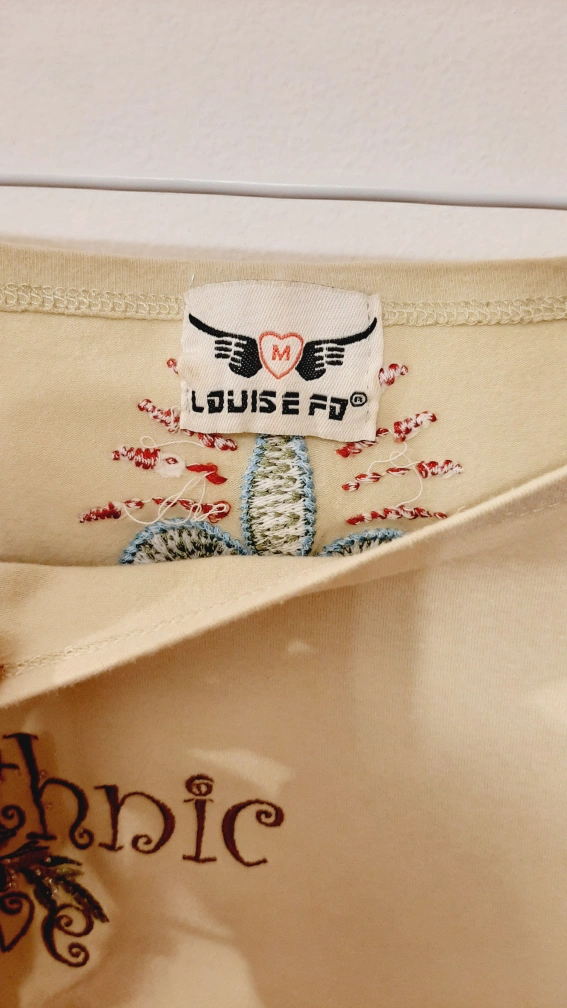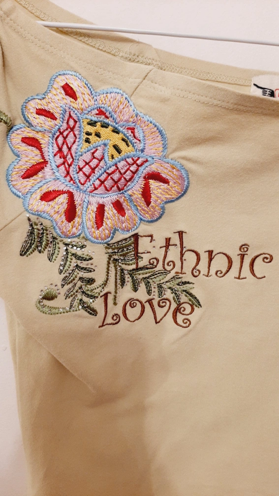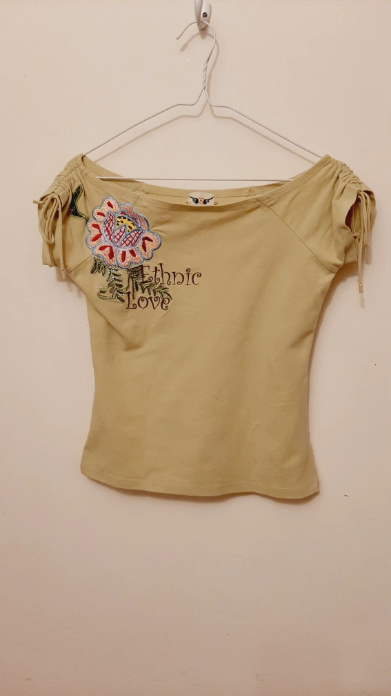 Off-the-shoulder Light green top. Features beautiful floral embroidery and "Ethnic Love" text. Short sleeves with drawstring detailing. Embroidered details on the front and back.
