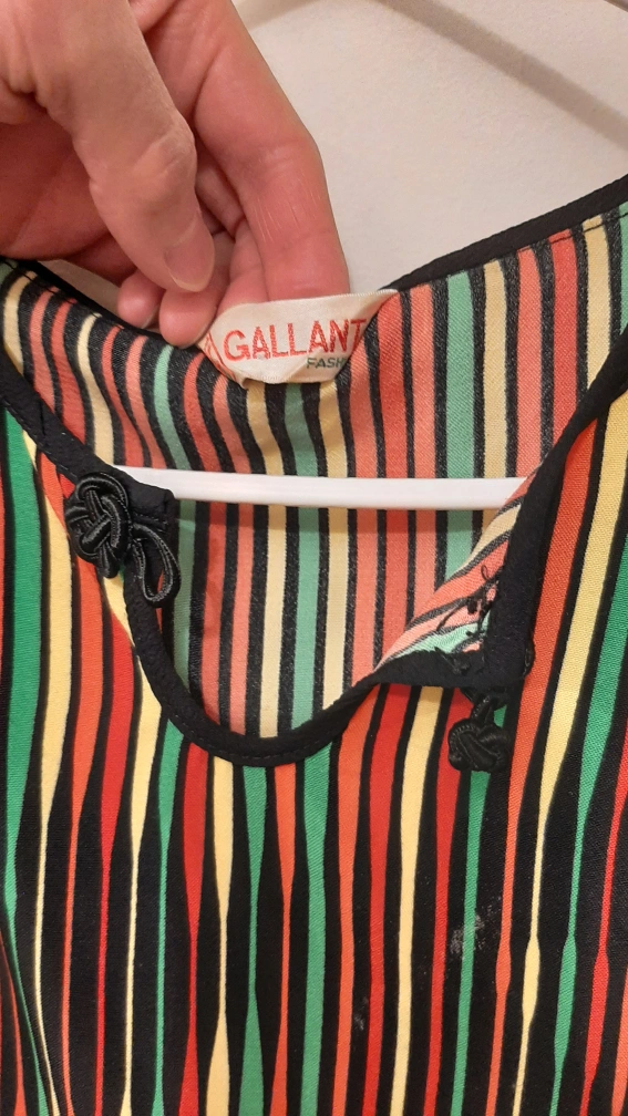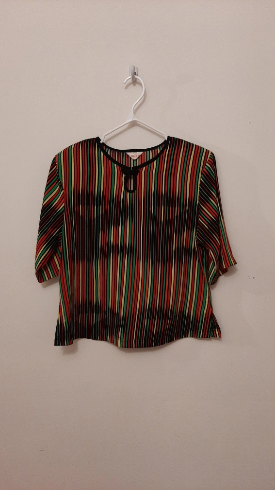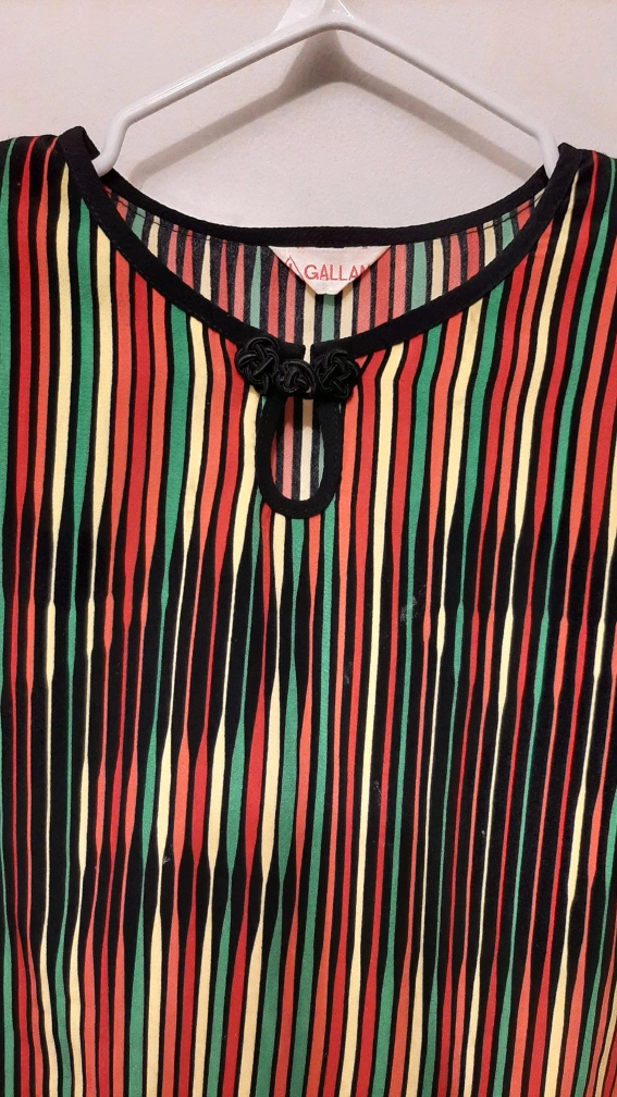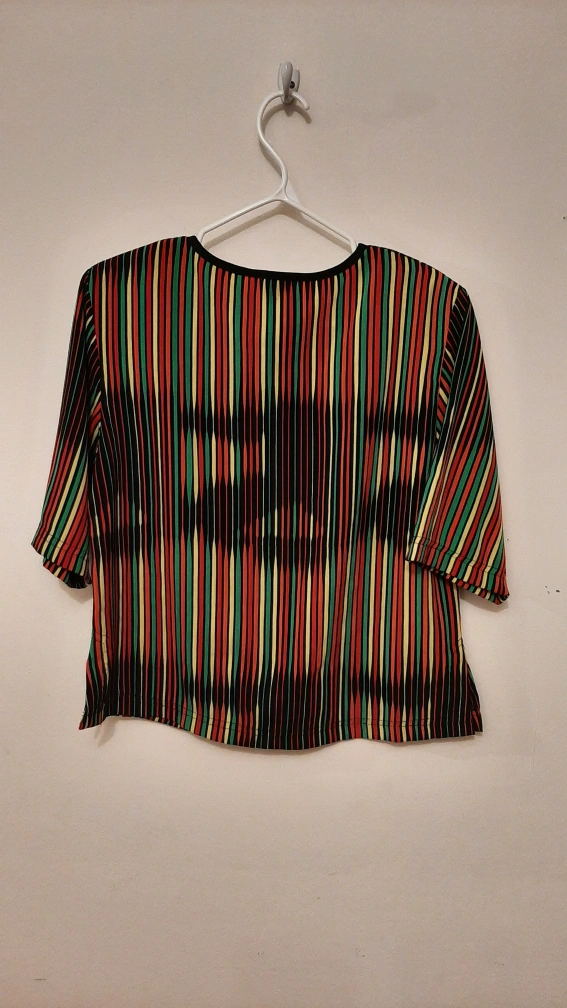 Short sleeve collared blouse. Multicoloured vertical stripes on black background. Keyhole neckline with knotted accents. Lightweight material.