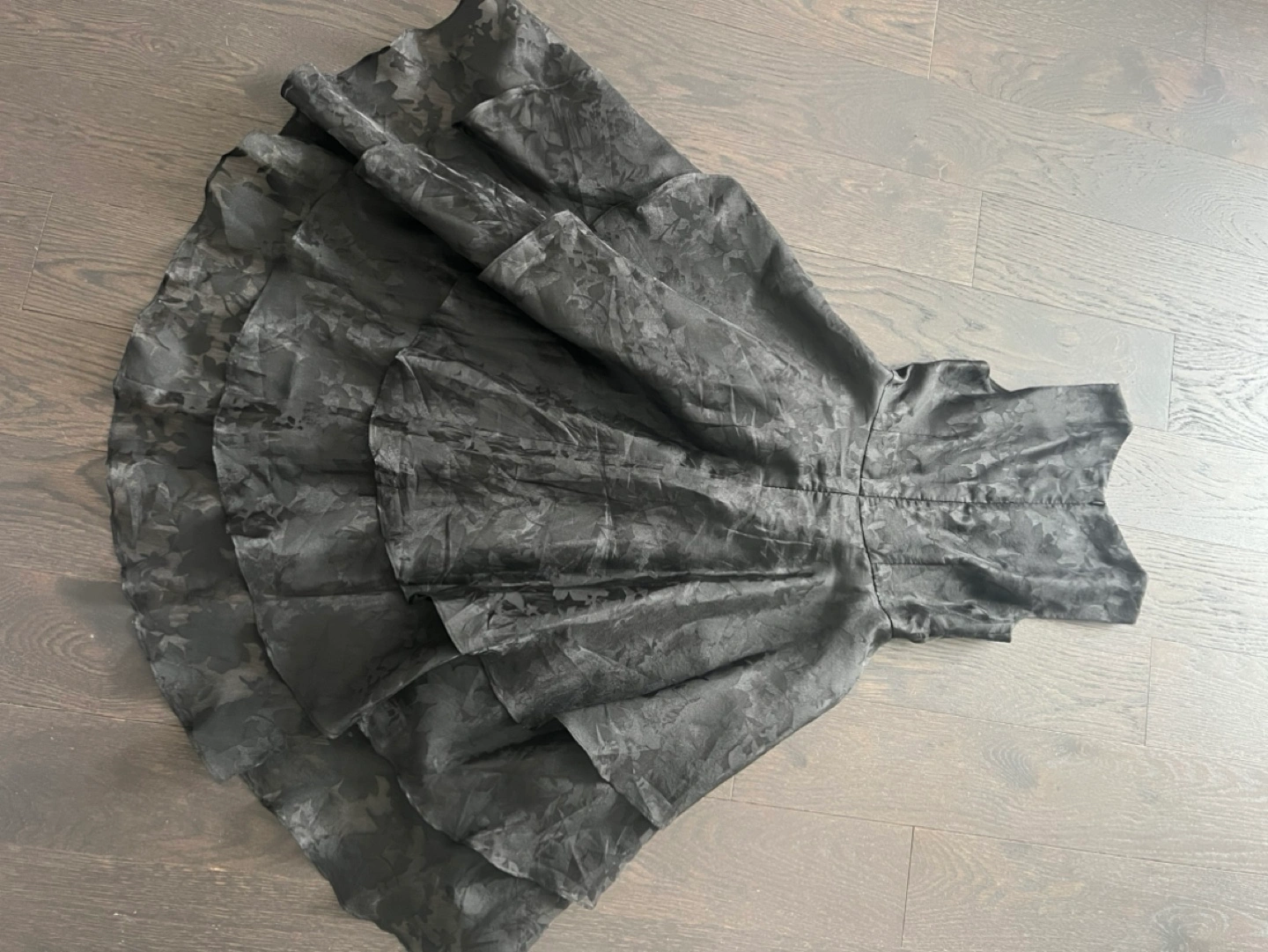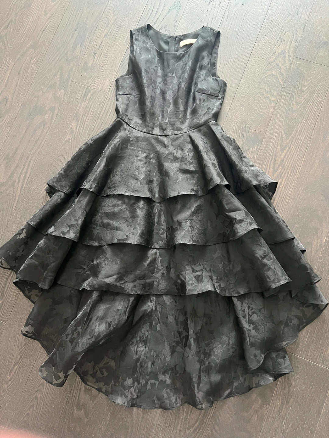 Elegant black dress. High-low hemline. Multiple layers. Sleeveless. Floral pattern. Great for special occasions.