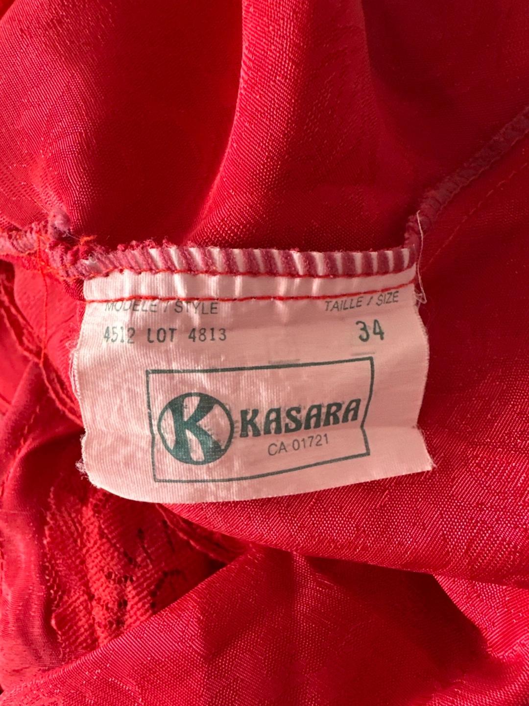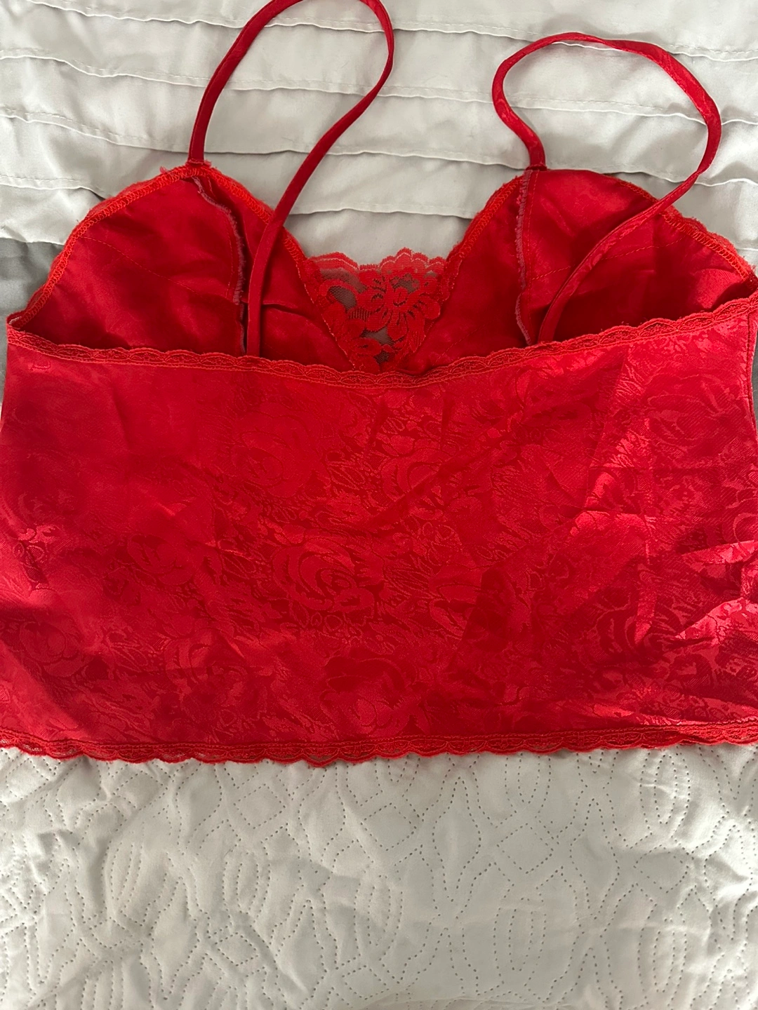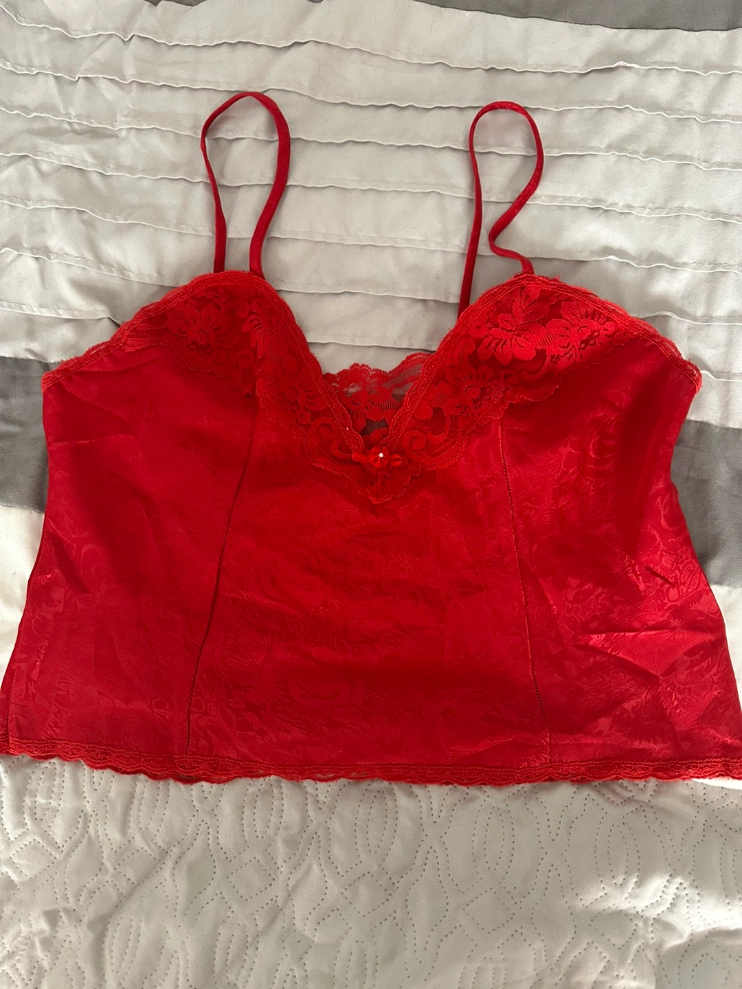 Red camisole, size 34. Features delicate lace trim at the neckline and bottom hem. Spaghetti straps. Vintage piece.