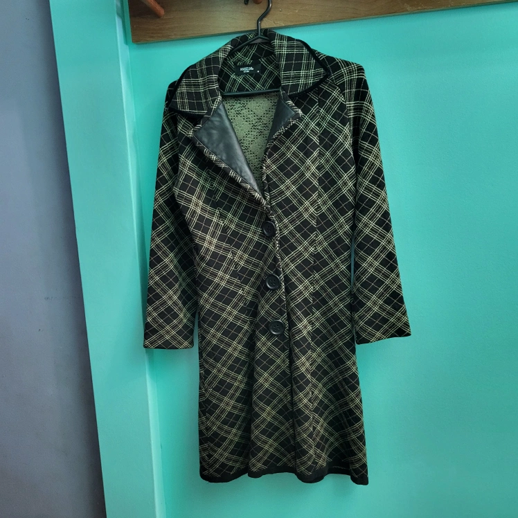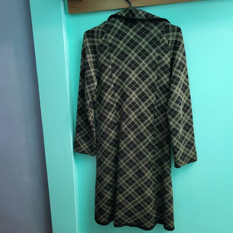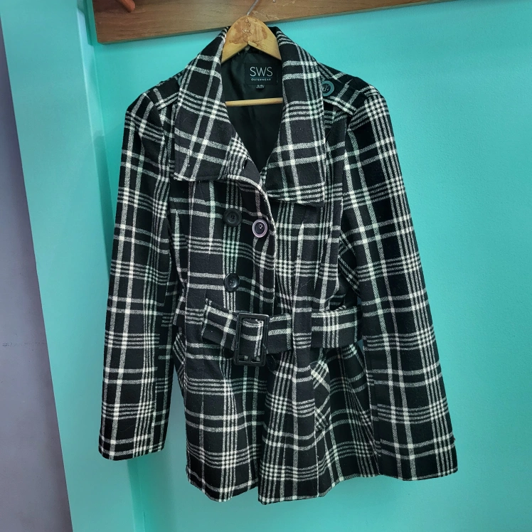 Women's size medium coat. Black and white plaid pattern. Long sleeves. Collared. Belt included. 100% Acrylic. knee length. fits small M