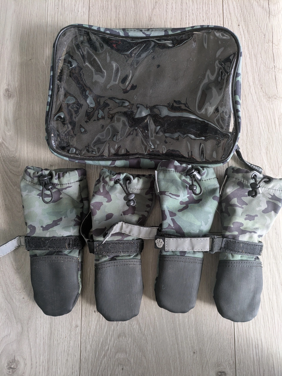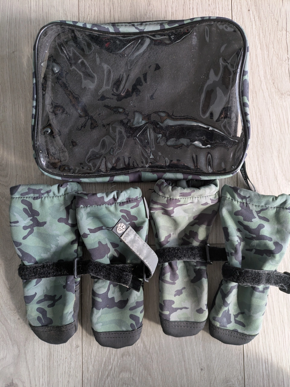 These boots are perfect for protecting your fur baby's paws, especially from all the snow salt that's been needed this winter that is terrible for dog paws! - Set of four camo print dog boots with reflective straps for added visibility at night. - Size 3 (see chart). Includes original carrying case. - Retails for $63 (plus tax = $71) - Barely used - this price is a steal!