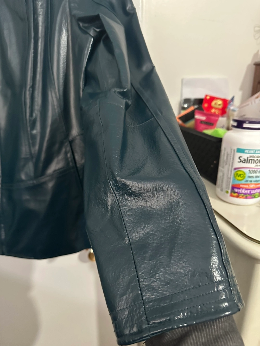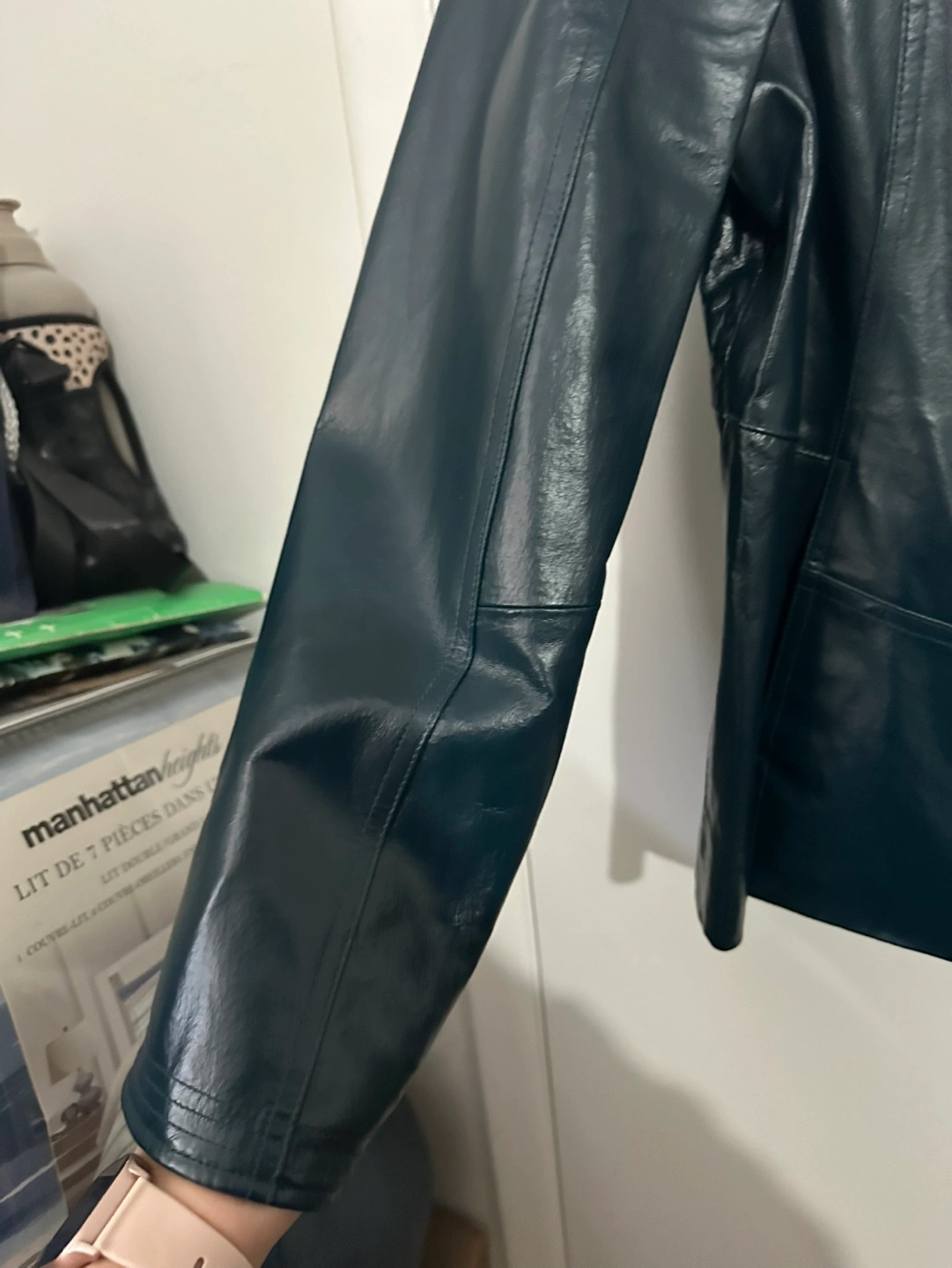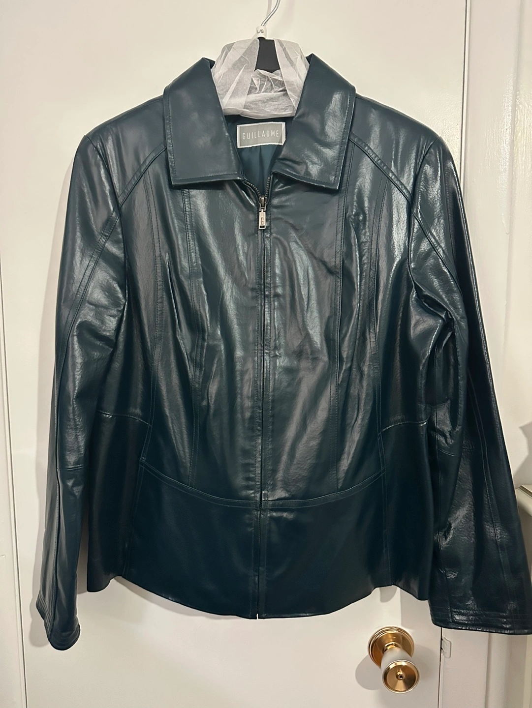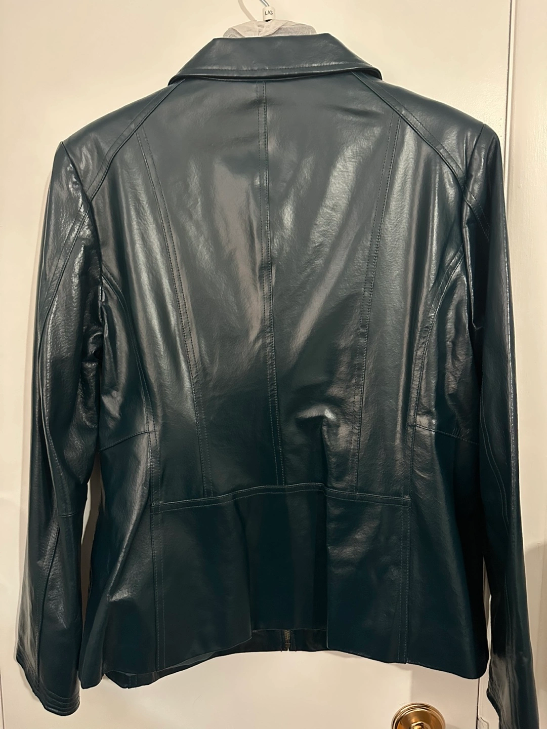 Women's dark teal leather jacket. Zip-up front. Long sleeves. Fully lined with no rips or loose threads, one inside pocket, Classic style. Brand new, never worn, smoke free home.