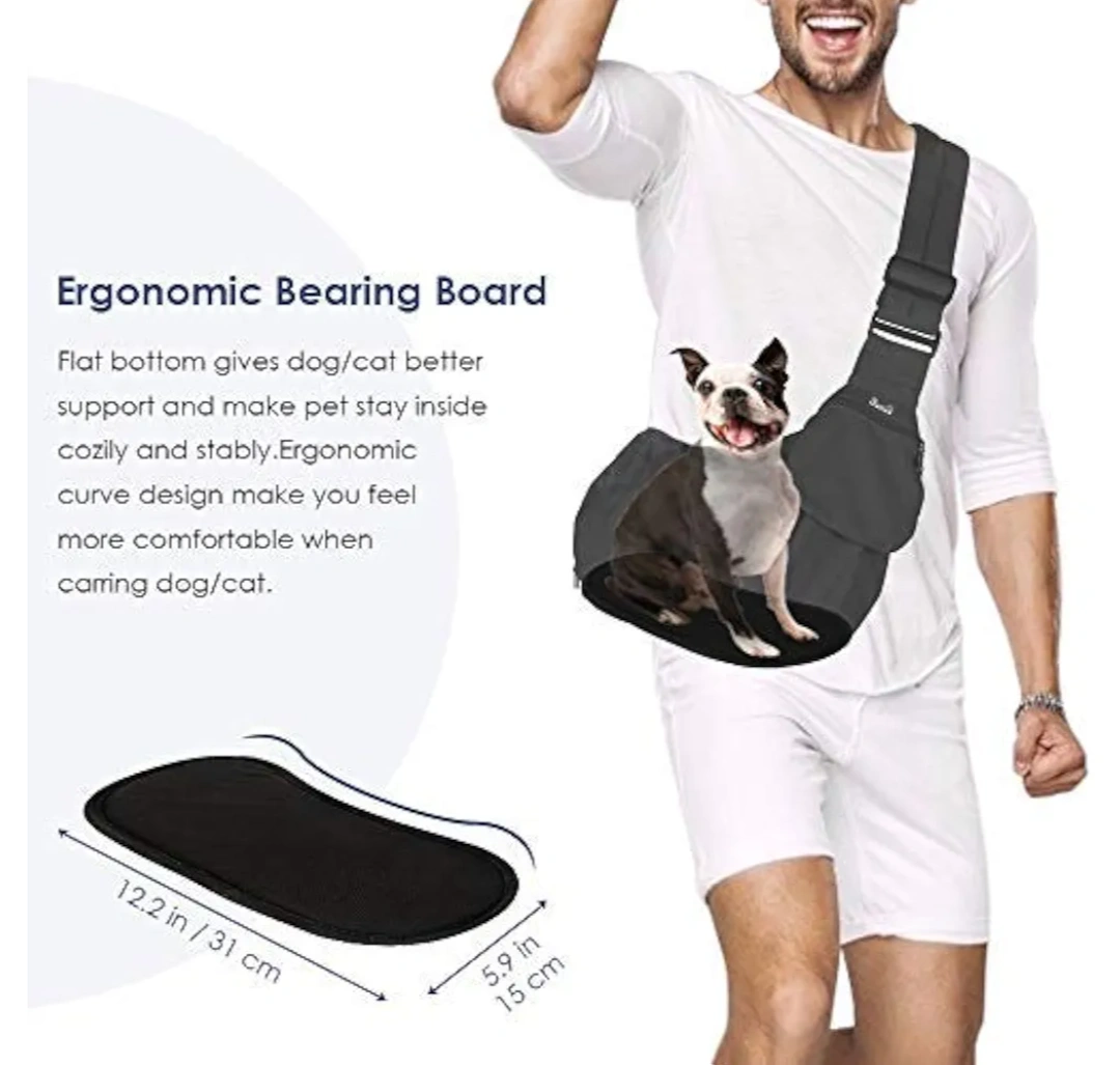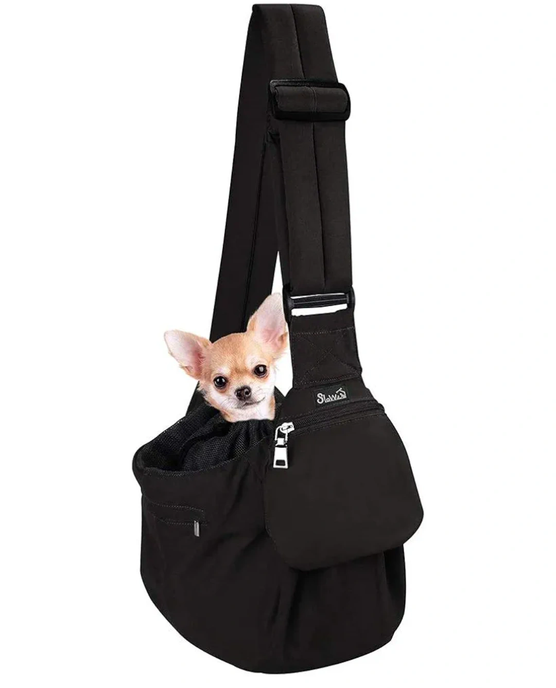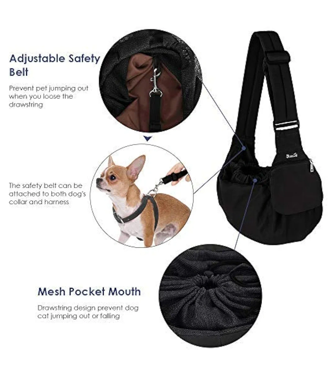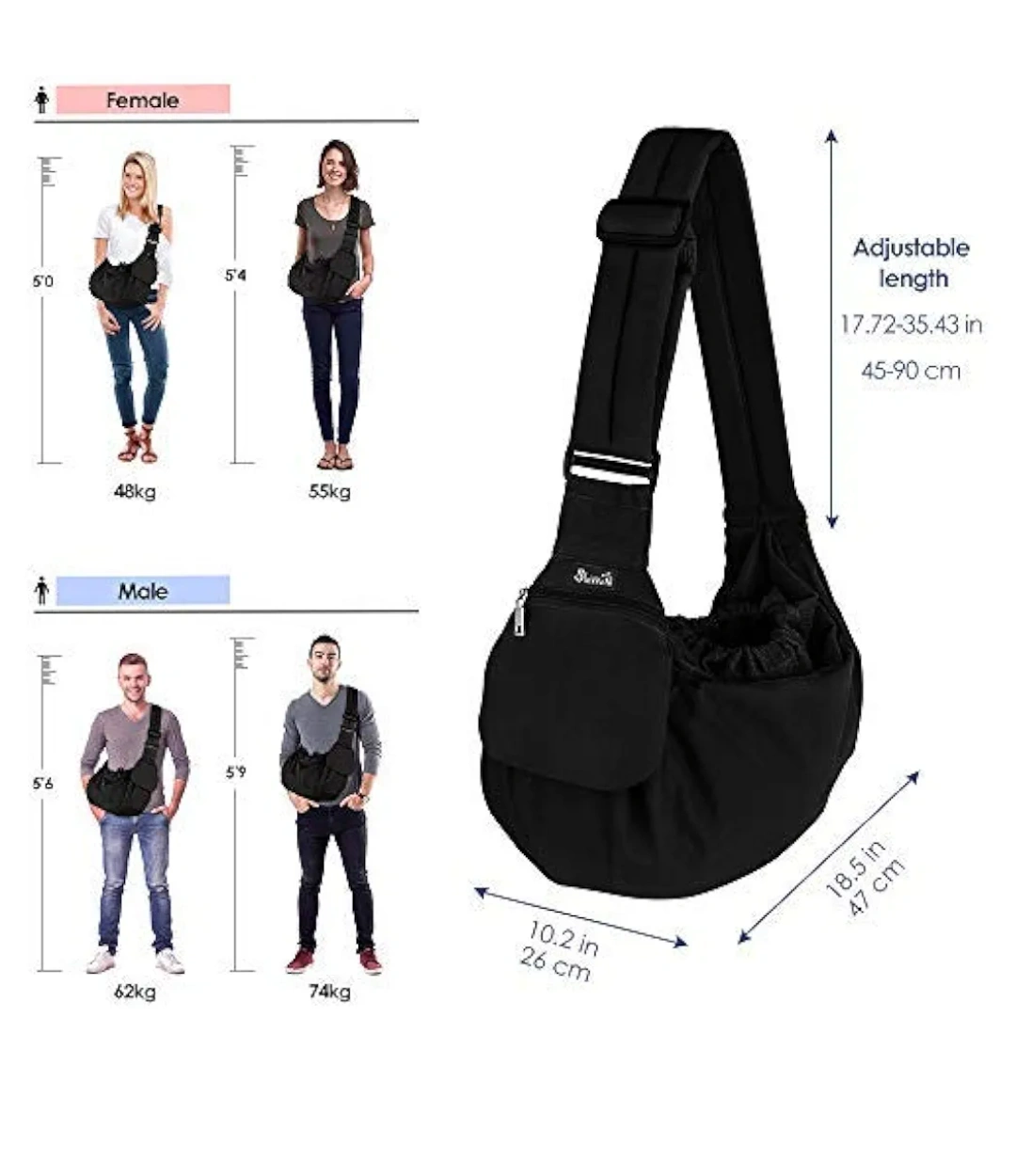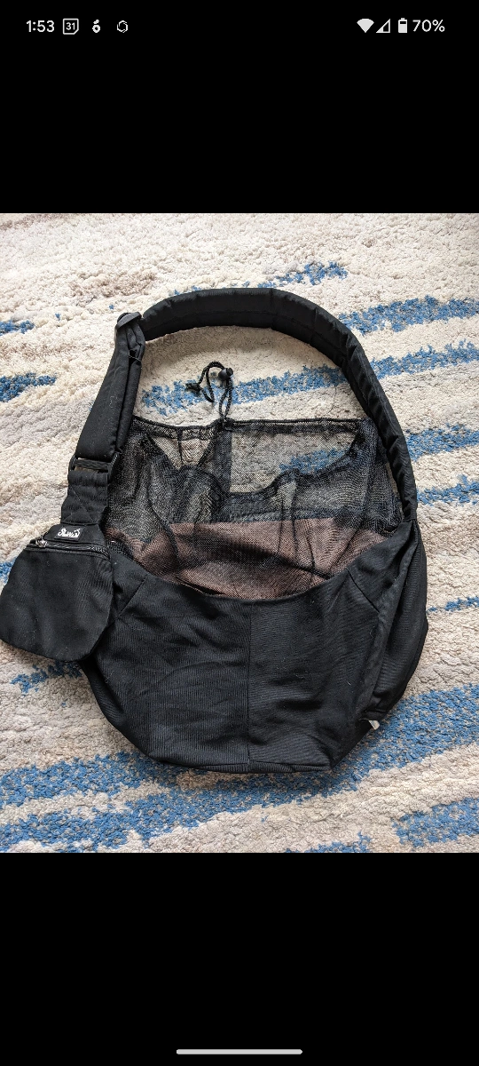Pet carrier in a sling style in perfect condition. Black machine washable fabric. Has a sturdy bottom to support your pet more comfortably. Features mesh pocket and safety belt. Small to medium-small sized pet.