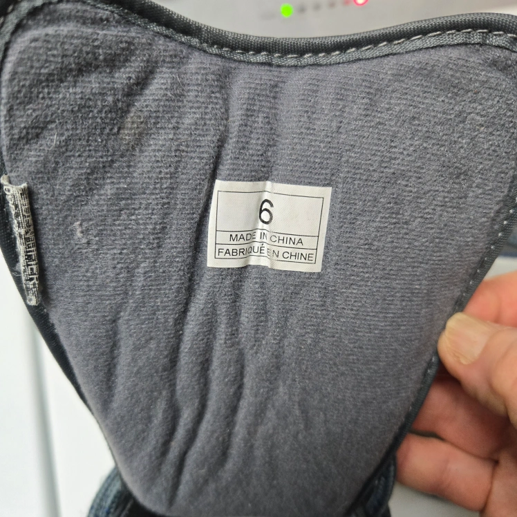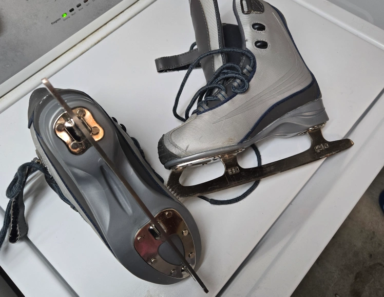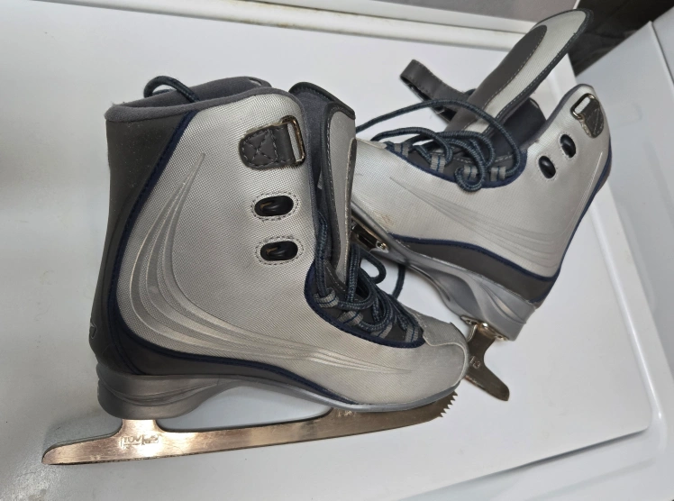 Pair of used ladies' figure skates. Size 6. Silver and grey. Lace-up style with Velcro straps to ensure tight fit around ankles