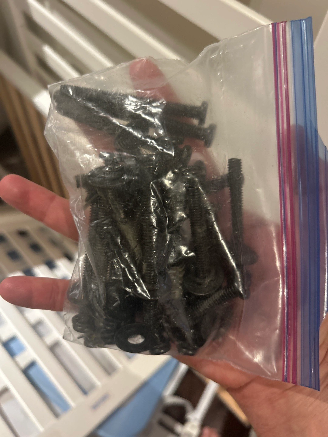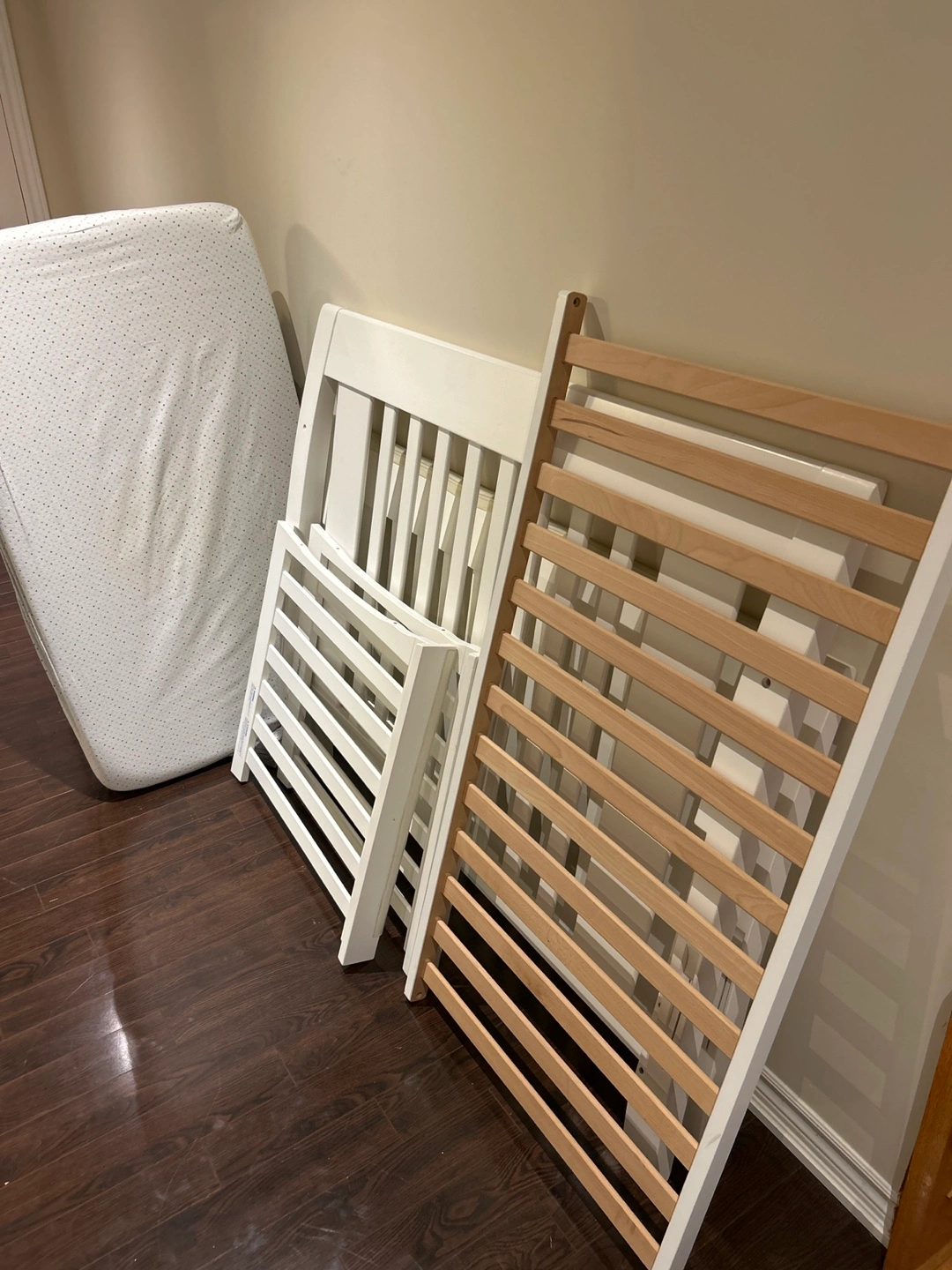 White crib (dissembled) includes side rails and mattress. Suitable for toddler bed conversion. Some assembly required. All screws included Here is the manual https://www.pali-design.com/docs/AIM-9100-090630-1145.pdf