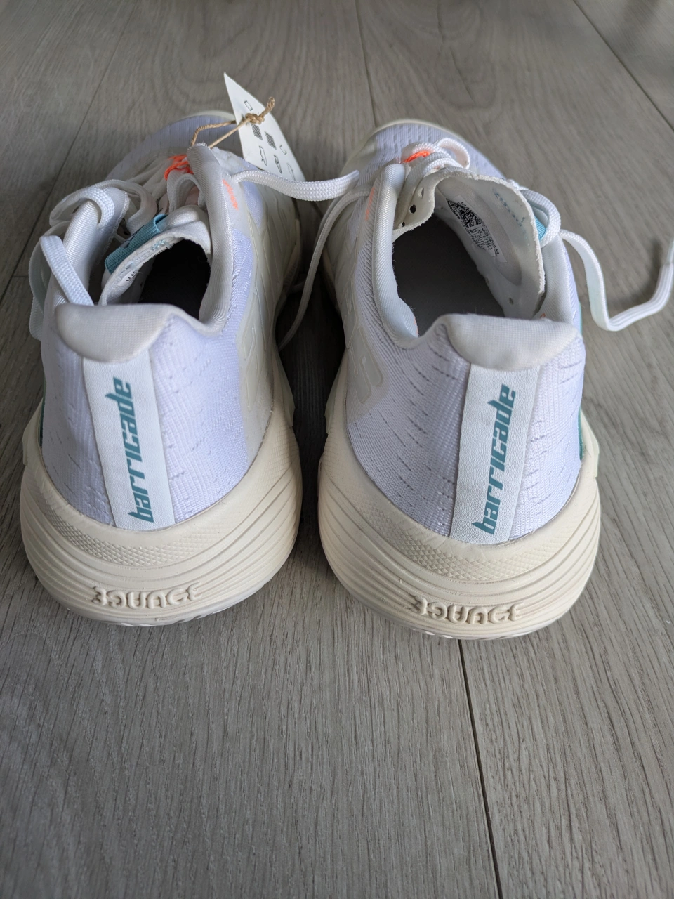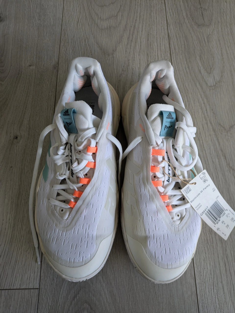 BNWT. Adidas Barricade Parley women's tennis shoes. Size 6 Women's US. Features ankle support cushion bubbles. Brand new, never worn (new with tags). Retails for $130+, priced to sell as I declutter. Selling only because they're too small for me. Moving sale - check out my other listings ✨