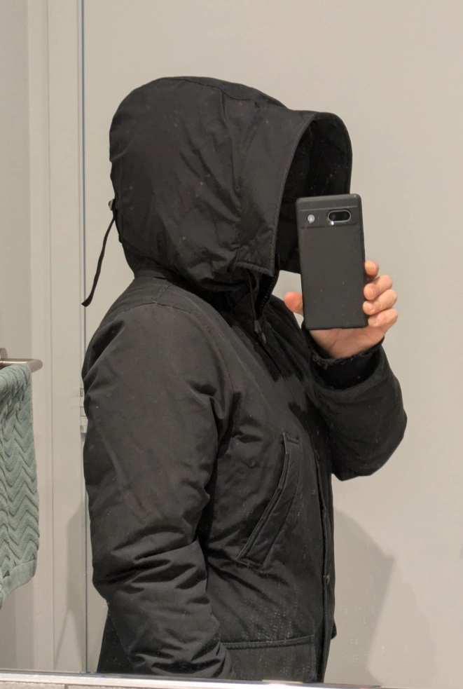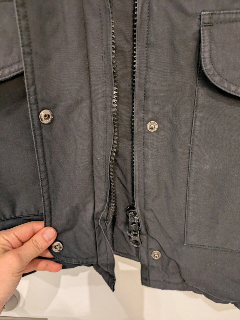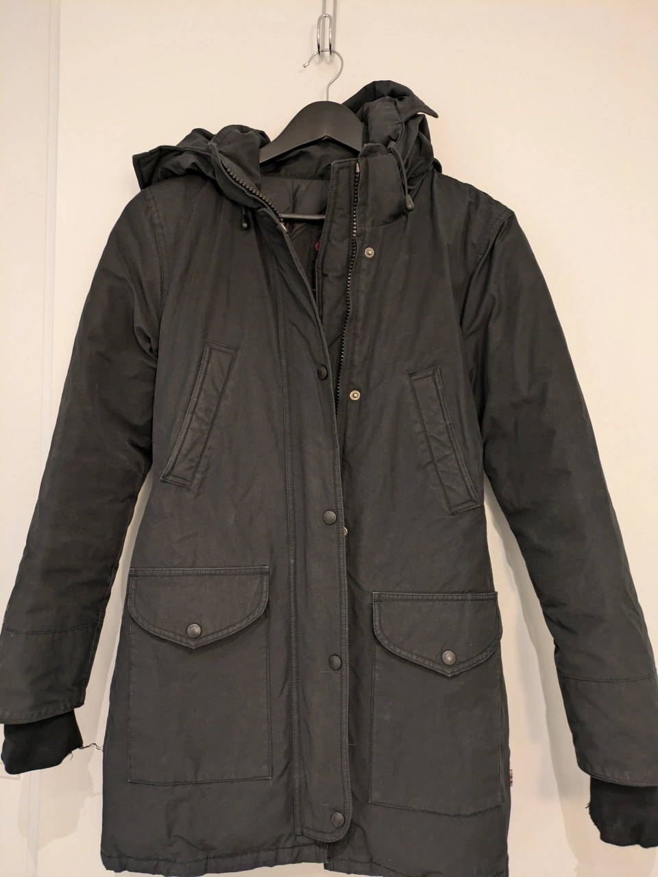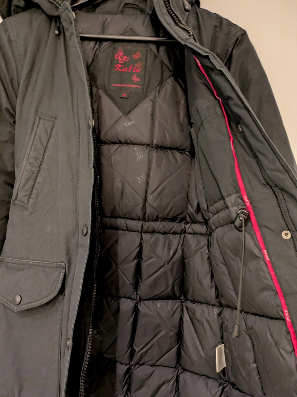 Very warm XS women's black winter jacket. Because it is 90% down feather filled, it is light weight while being very warm! - Features deep fleece-lined chest pockets and regular waist pockets, and an inner chest pocket. - Two way zipper allows lower half to unzip for increased mobility. - Ultra deep hood blocks out wind and snow effectively. - When not in use, hood edge can be folded back and secured down w an attached hood buckle to minimize bulk. - Elastic drawstrings at waist and hood allow for cinching and a cute silhouette. The jacket has been well-loved, and the wristbands are stretched out (as pictured), but there are no holes or tears on the body of the jacket and does not compromise the warmth of it. FREE because too good to throw away and I'd like it to go to someone who needs a warm coat!