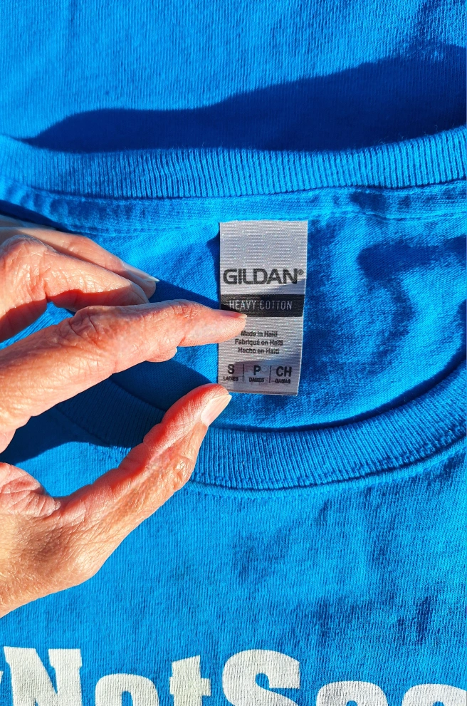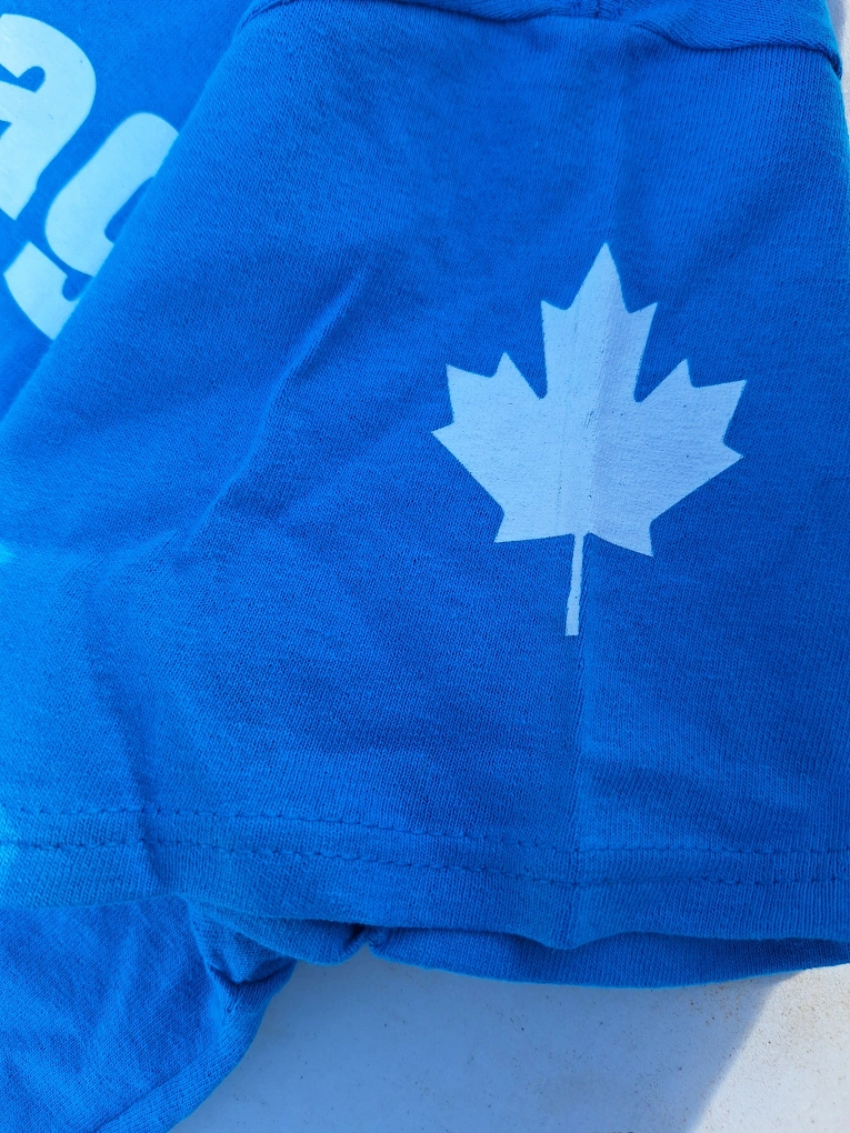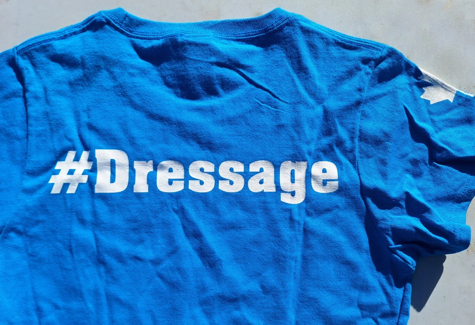 Bright blue new Gildan t-shirt. Features white screen-printed text, "#Dressage" on the back and "#NotSoccer" on the front. Canadian maple leaf graphic on sleeve. Size small. For a "dressage mom" to wear to her child's show, for schooling or casual riding, or for everyday wear. Proceeds to cat rescue, Kit Cat Club Of Hamilton Upper Wentworth and Concession area Hamilton mountain Currently in storage downtown