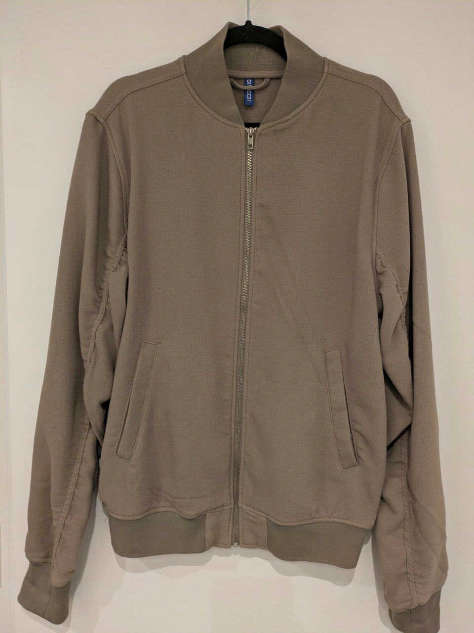 Men's H&M taupe bomber jacket. Zip-up front and ribbed cuffs and hem. Two front pockets. Lightweight fabric, great for spring or layering under winter coat.