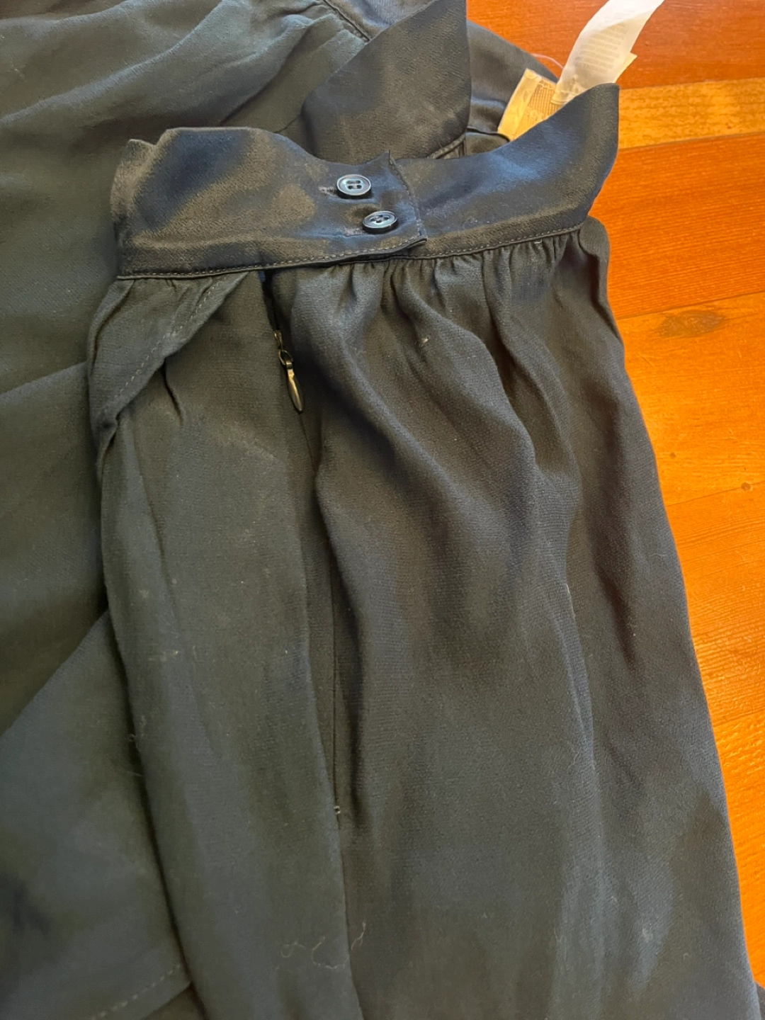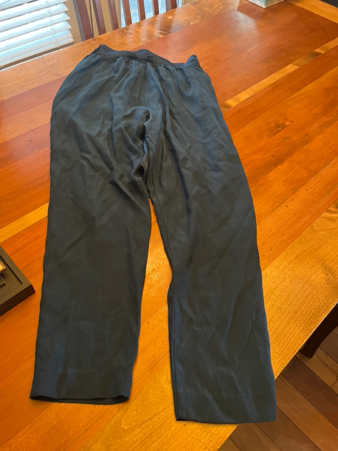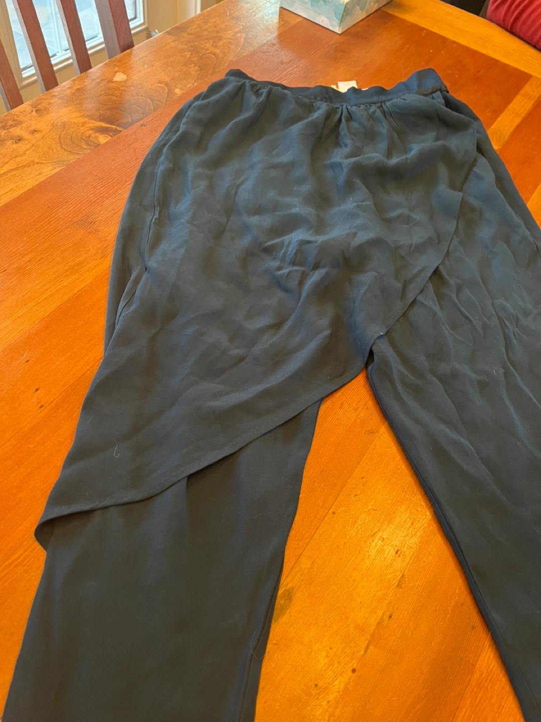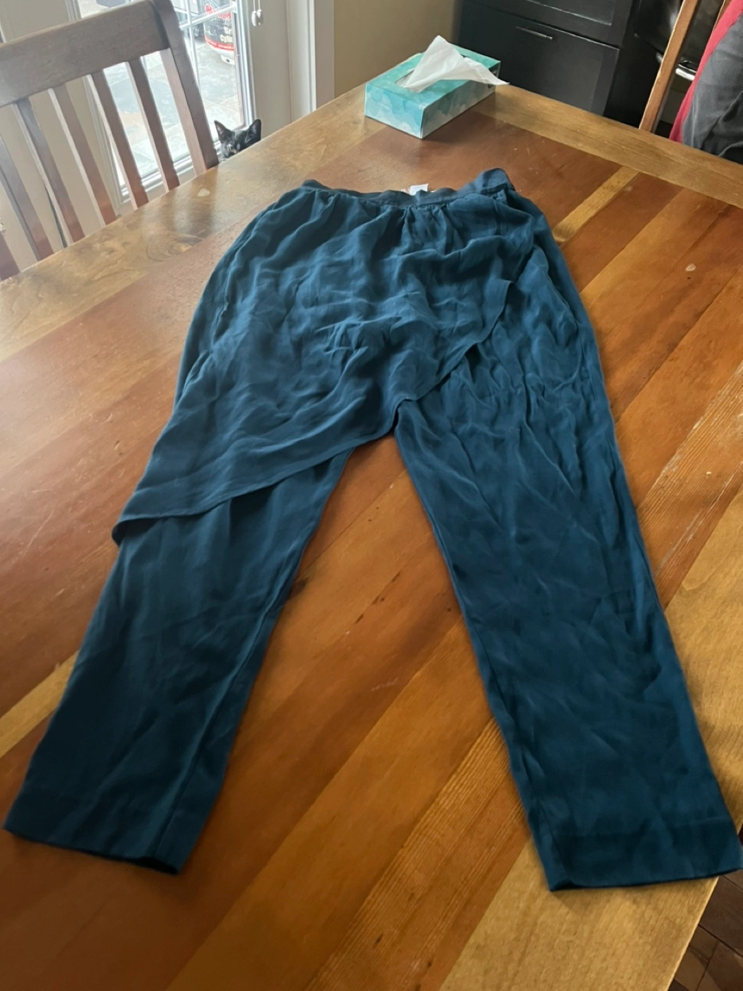 Dark teal culotte pants with elastic waistband. Size 2. Layered skirt on top in front. Hidden zipper closure and pockets. Colour is closest to photo 1. Pick up close to Hastings and Boundary. Note: we have a cat.