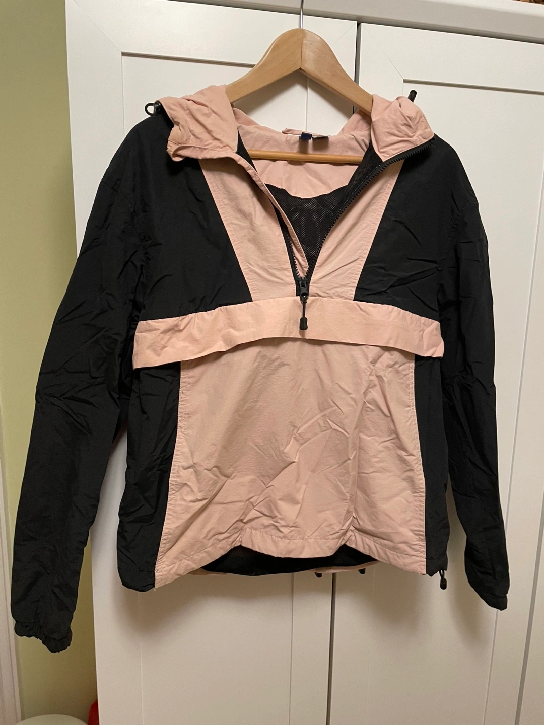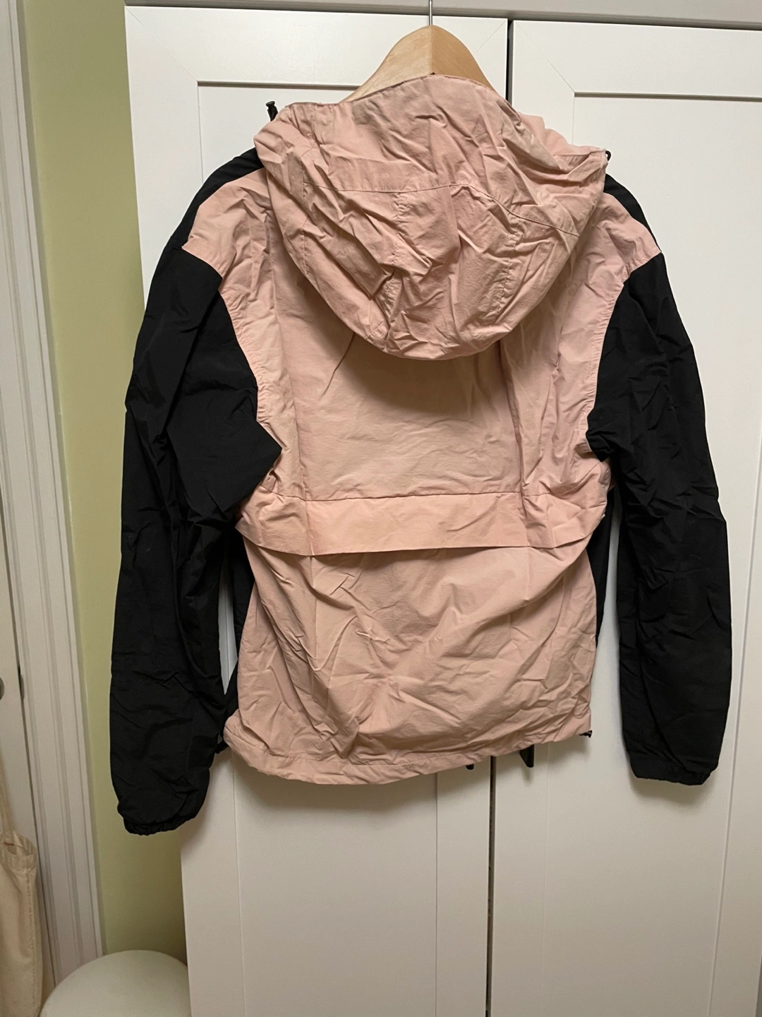 Women’s XS windbreaker jacket. Good quality but too small for me. Half zip closure and drawstring hood and waist adjusters. Large front pocket/pouch. No known damage. Hard price. Can deliver for an additional $5 flat. :)