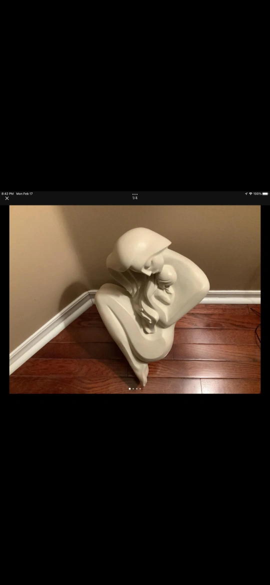 Cream-coloured abstract sculpture. Depicts a woman holding a child. Modern design. Great statement piece for home decor.