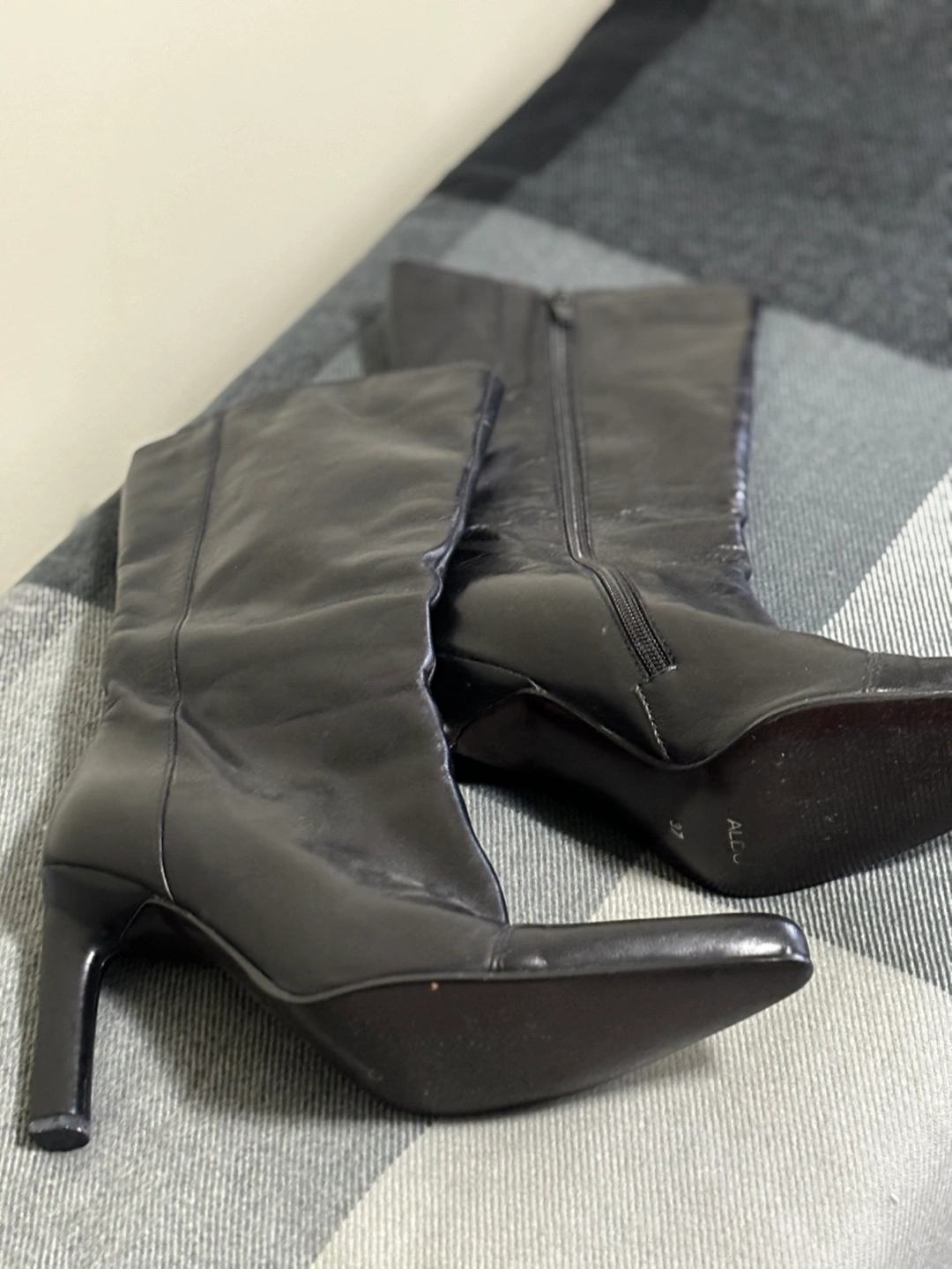 Pair of black leather knee-high boots. Pointed toe. High heels. Zip closure. Size 7. For pick up only please.