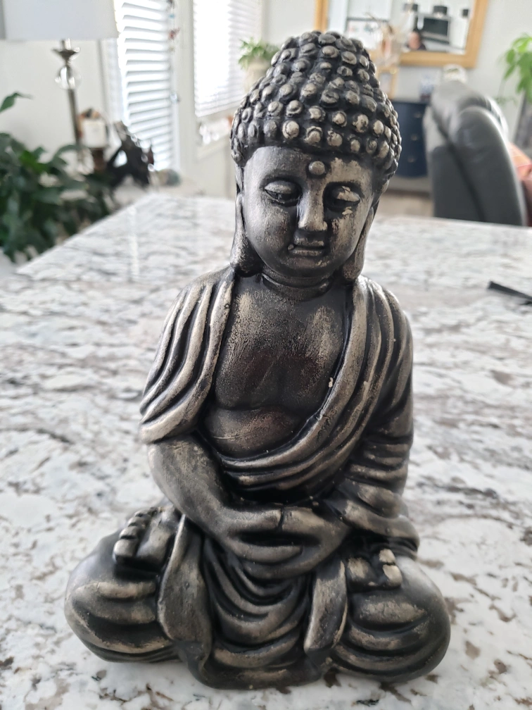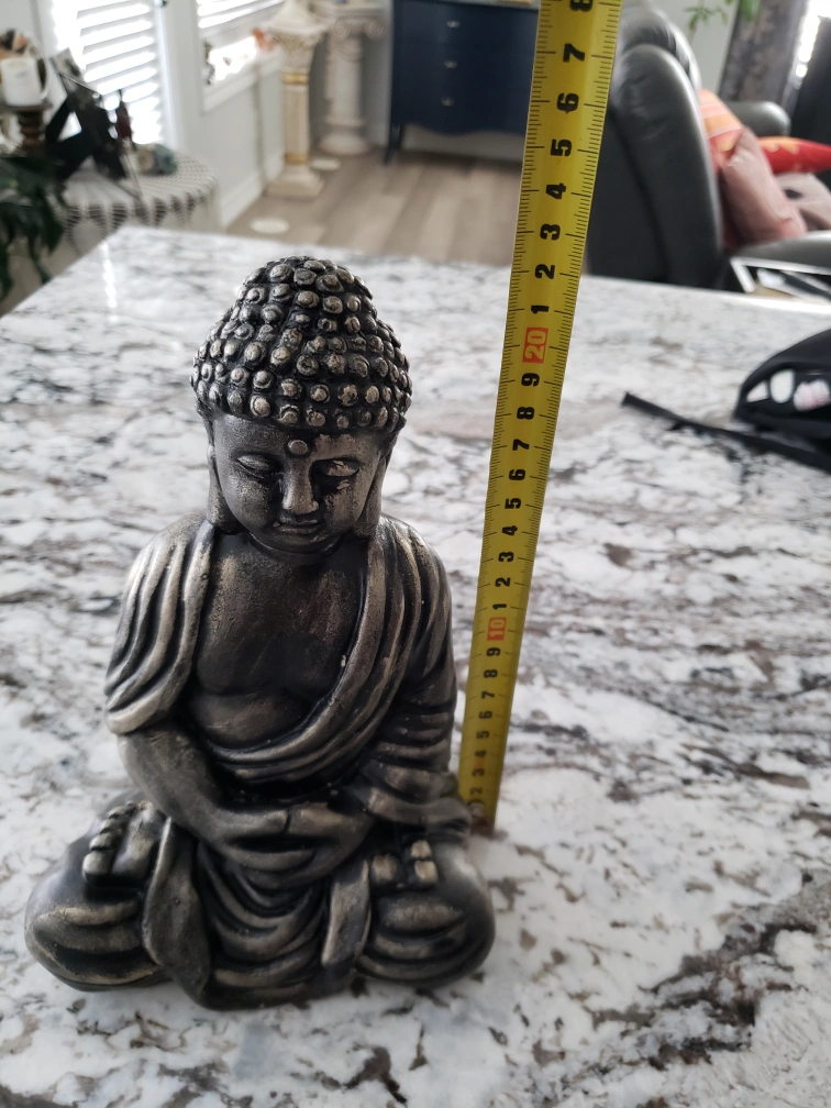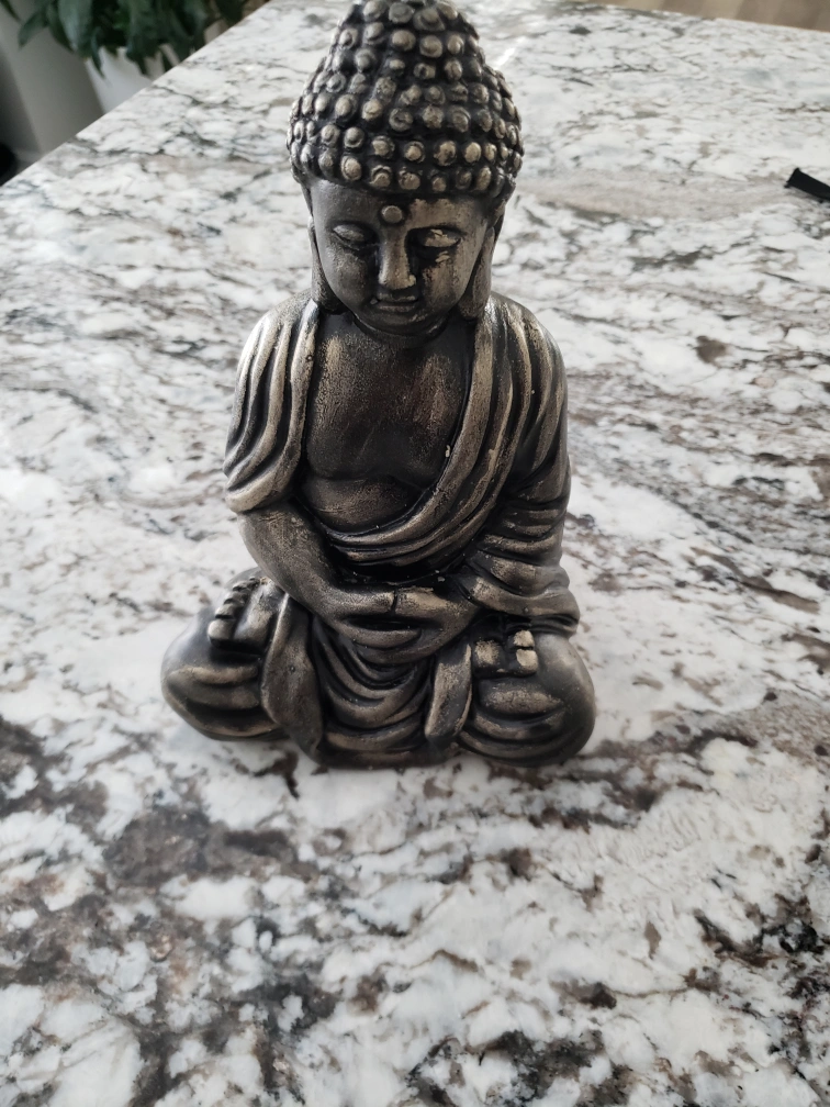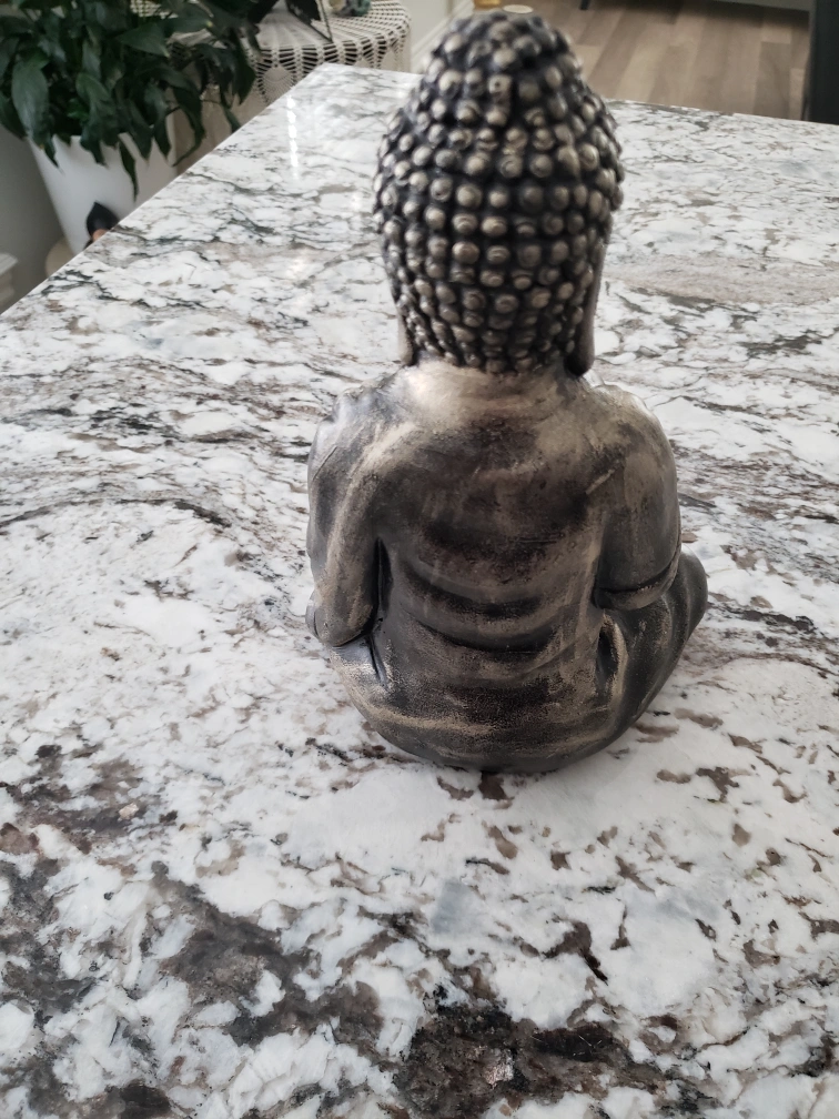 Small heavyl Buddha statue. Dark grey/black with old gold finish. Measures approximately 22 cm tall. Perfect for a shelf, desk, or altar.