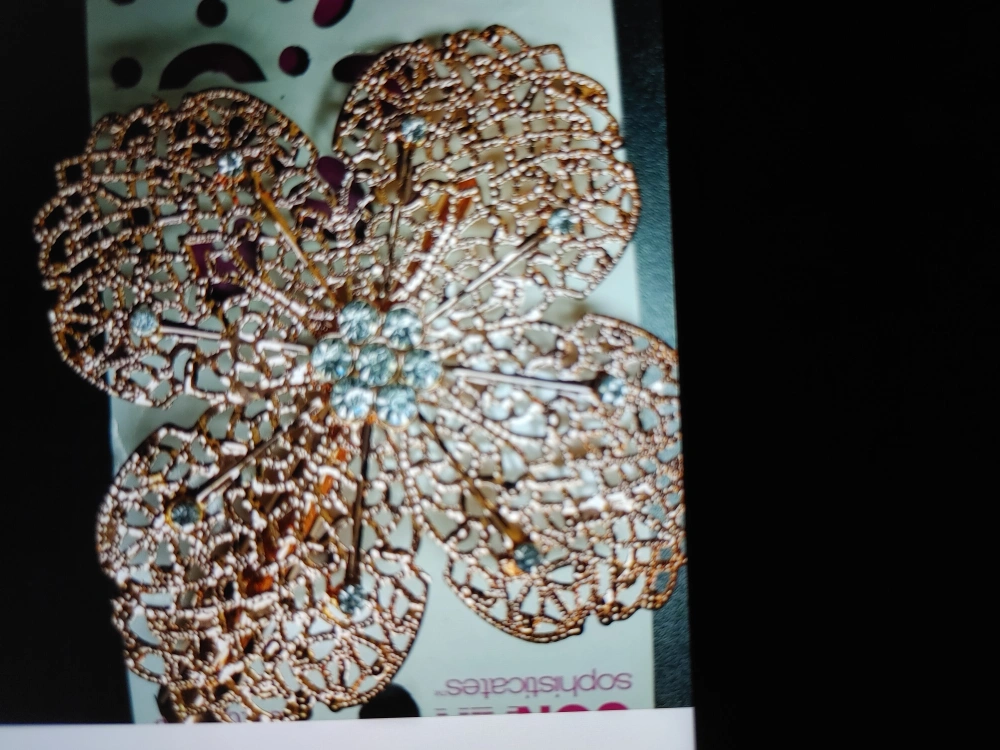 Ornate rose gold hair clip. Features delicate filigree design and clear rhinestone accents. Looks lovely in hair.