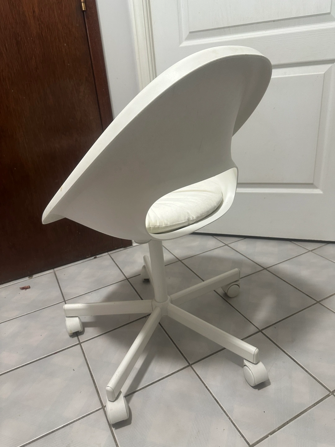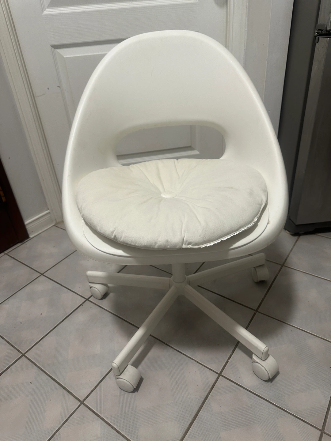 White plastic chair. Swivel base with casters. Includes a removable white cushion. Good for a home office or child's room. ⚠️Check out my other listings for more. NEEDS to be gone by Feb 18 … 19th at the latest ‼️