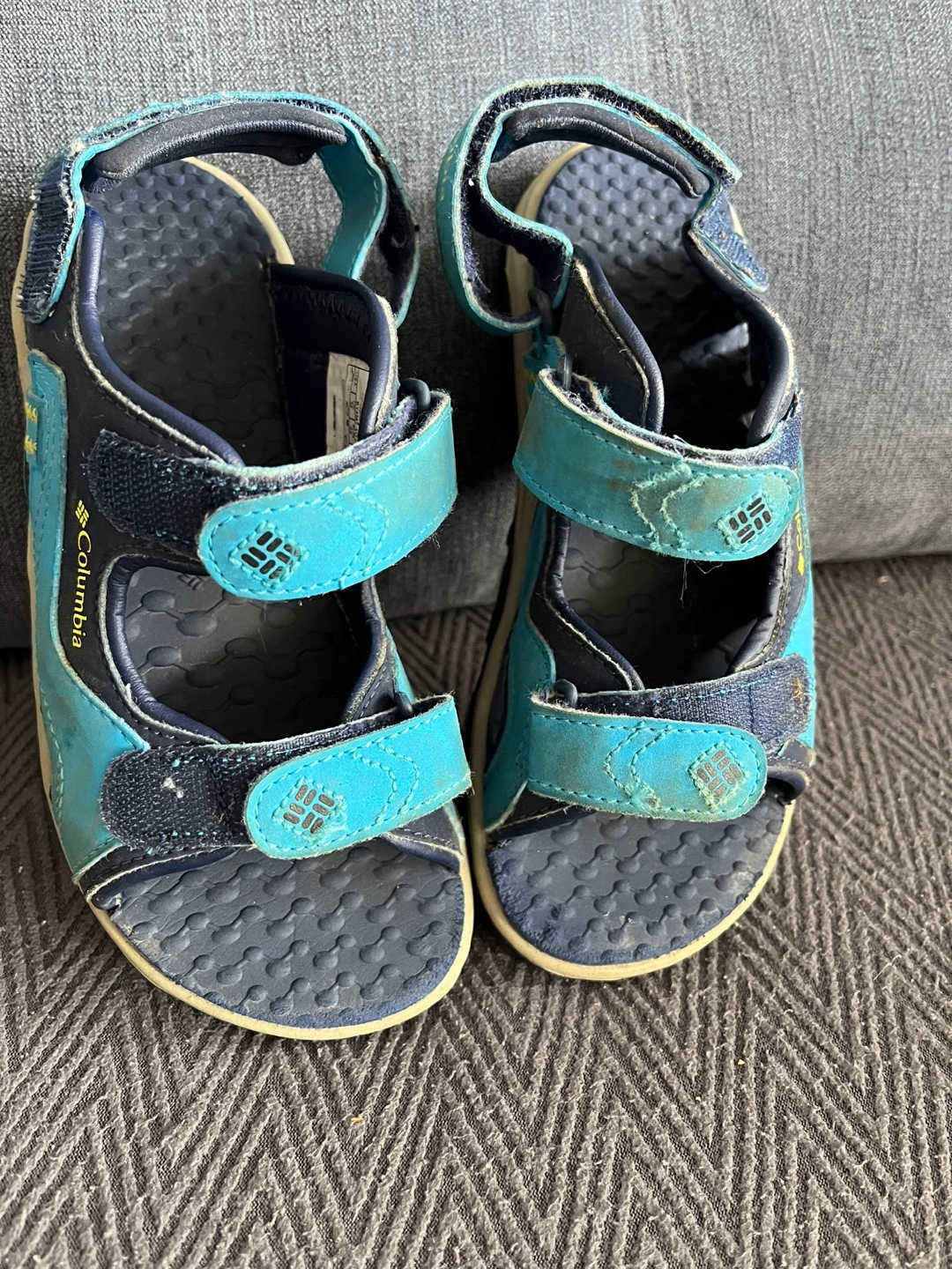 Used Columbia brand kids' sandals. Blue and navy colour. Adjustable straps. Show some wear.