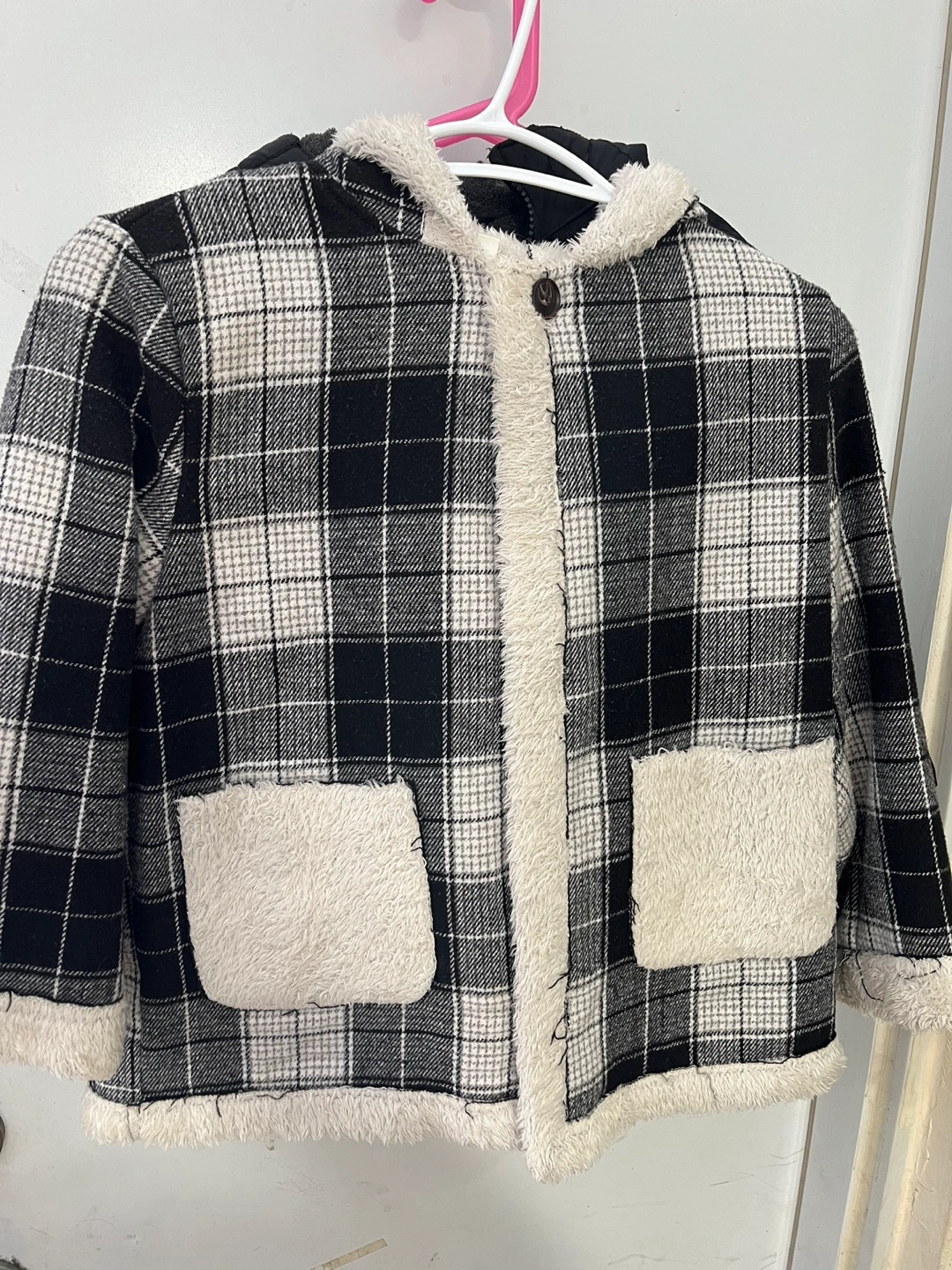Cute kids' jacket. Black and white plaid pattern. Soft fleece lining. Two front pockets. Hoodie. Size 7 unisex