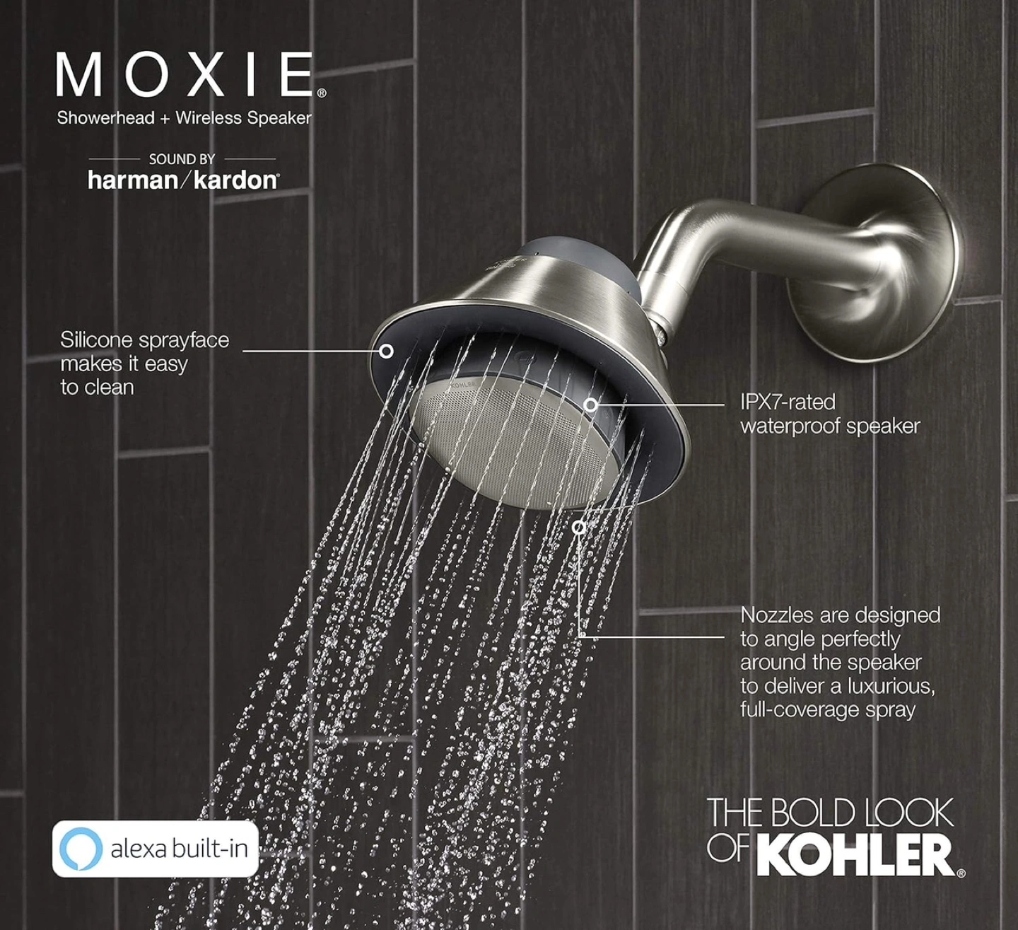 Retail Price + tax = $180.79 Meet/Pick-up Keele & Eglinton Cash Only Let superior sound wash over you, with the Moxie® showerhead and wireless speaker. Combining a luxurious spray with a best in class high-quality audio speaker with sound by Harman Kardon®, the all-new Moxie showerhead and wireless speaker elevates your everyday showering, turning any shower into an immersive sensory experience. Easily gear up or wind down with the perfect soundtrack or your favorite podcast. Plus, the speaker easily removes, so you can bring it wherever you want to go — the beach, a picnic, or just lounging in your backyard. The Moxie showerhead speaker is Bluetooth-enabled to pair with your phone or other device.