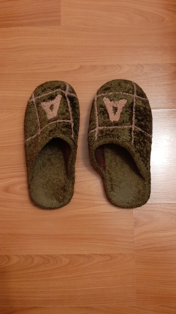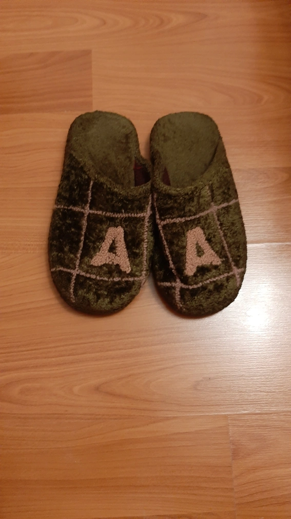 Pair of green slippers. Soft material. Size 41-42. 'A' embroidered on each slipper. Checkered pattern.