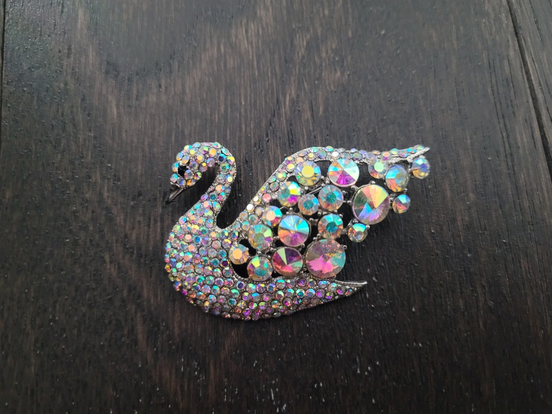 Brand new in orginal packaging, iridescent crystal swan brooch. Silver-tone metal.