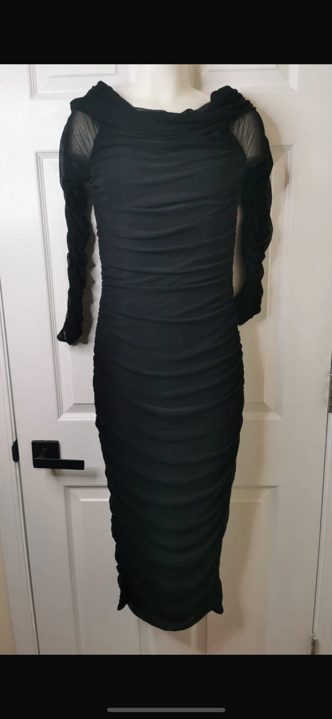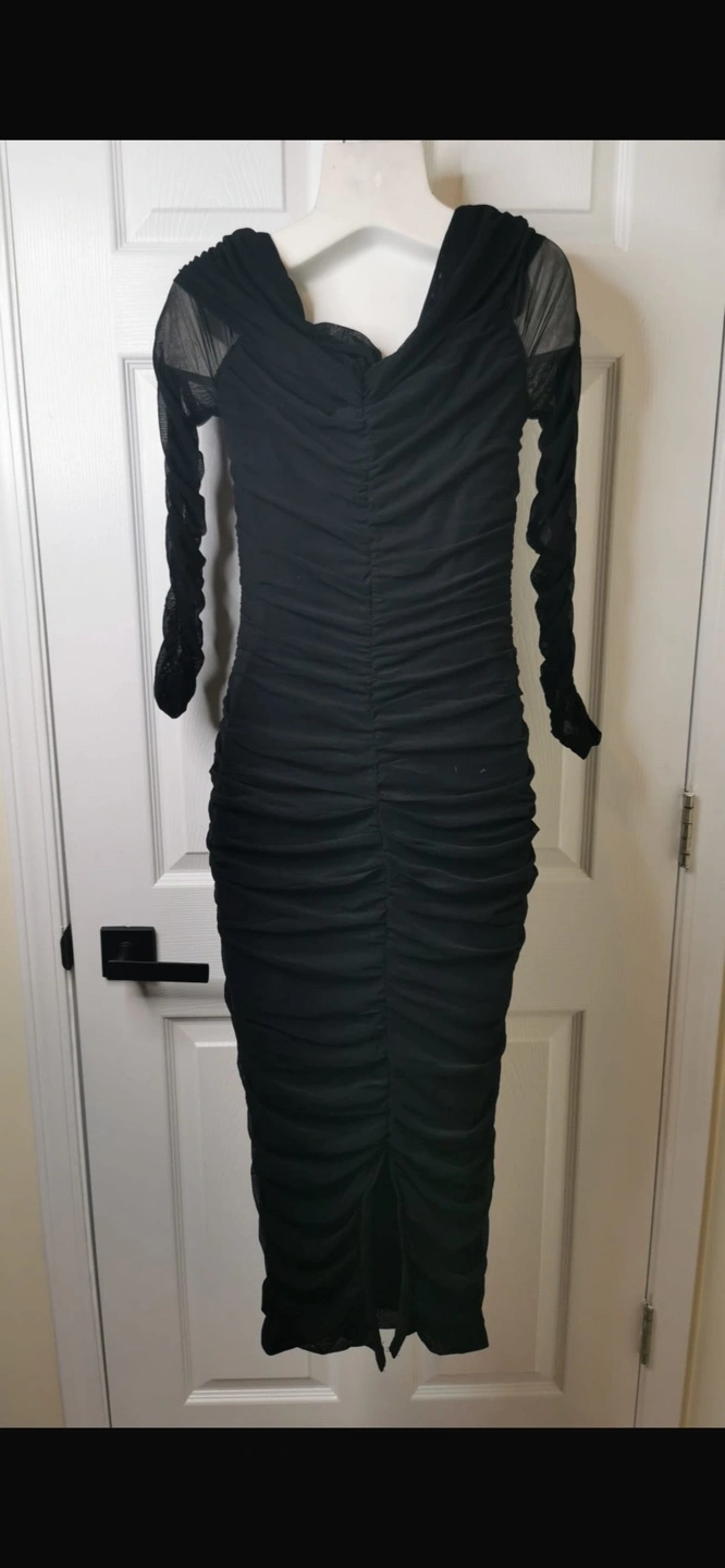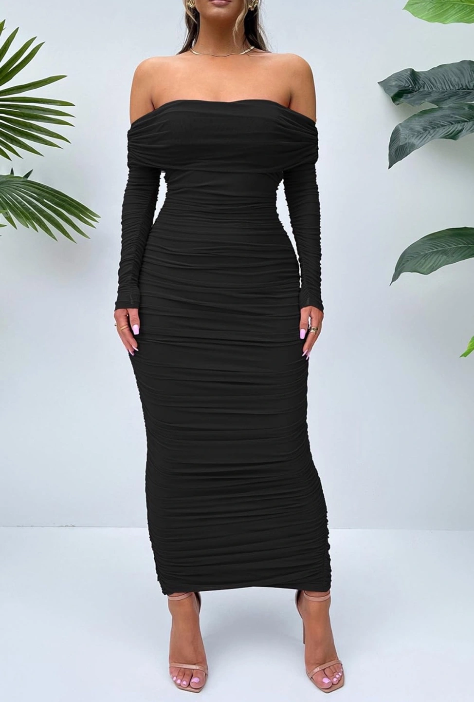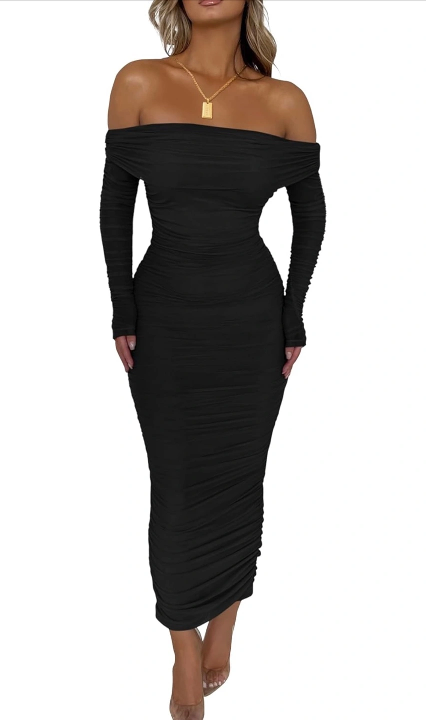 New with tag! Retails for $68. Two available- one size small and one size medium The Fabric Offers Just The Right Amount Of Stretch For A Comfortable Fit, Step Into The Fall Season With Confidence And Fashion-Forward Style EYE-CATCHING DESIGNS: Off The Shoulder Dress/ Bodycon Maxi Dress/ Long Dress For Women Casual/ Tight Fitted Dresses/ Womens Ruched Dress/ Womens Fall Fashion/ Long Sleeve Dress/ Dress With Slit/ Open Back Dress For Women. MATCHING STYLE: Whether It's A Formal Event Or A Night Out, This Dress Is Your Go-To Choice. Dress It Up With Beautiful Accessories And Heels For A Glamorous Look Or Keep It Casual With Boots For A More Relaxed Vibe SHOWING OFF YOUR CHARM: The Long Sleeve Dress Keeps You Warm, While The Body-Hugging Design Enhances Your Curves. The All-Over Pleats Create A Flattering And Feminine Look. The Maxi Dress Features A Slit At The Back, Allowing You To Move With Ease While Exuding Confidence And Charm. This Dress Is Designed To Make You Feel Fabulous And Elegant On Any Occasion, Wedding, Cocktail, Holiday Party, Dating, Nigh Out, Club Stunning black maxi dress. Off-the-shoulder neckline, long sleeves, and ruched detailing throughout. Floor-length silhouette. Perfect for a special occasion.