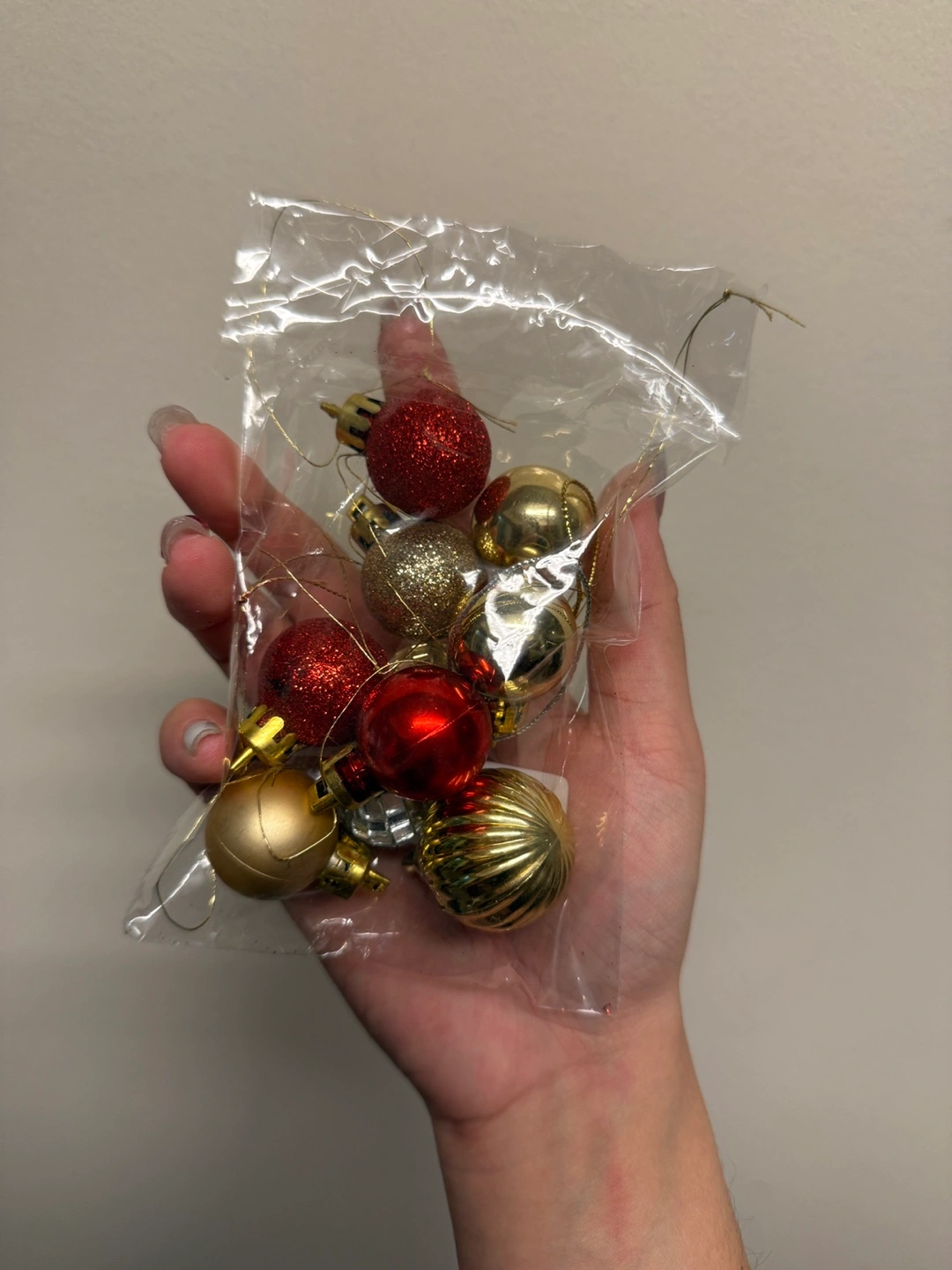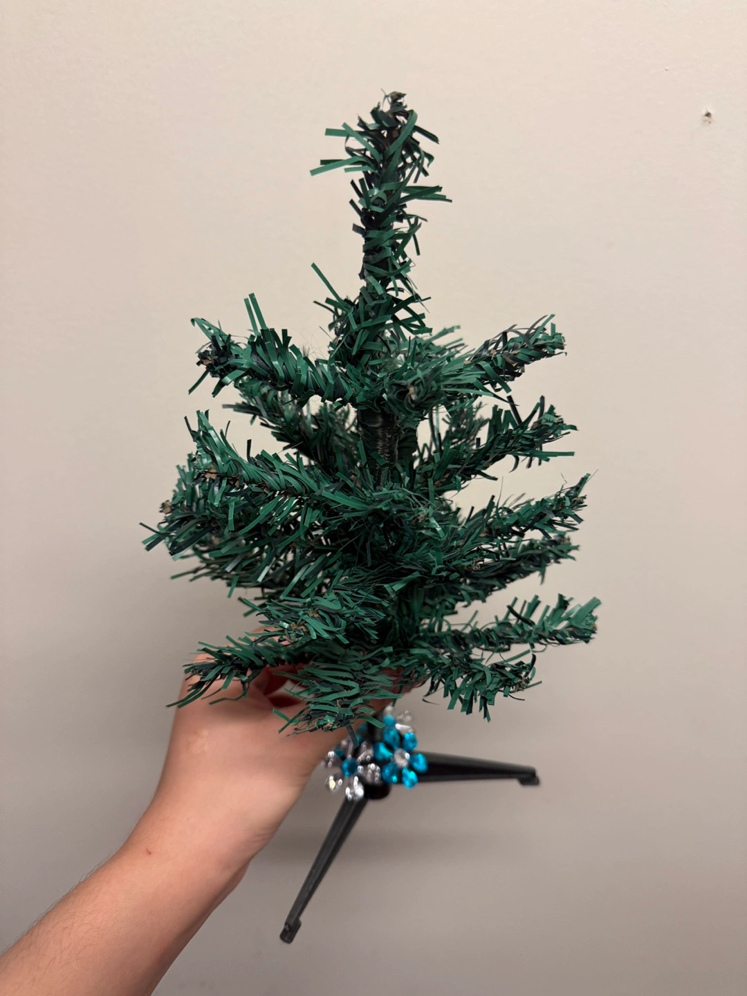 Small artificial Christmas tree, perfect for a desk or shelf. Includes a bag of small red and gold ornaments.